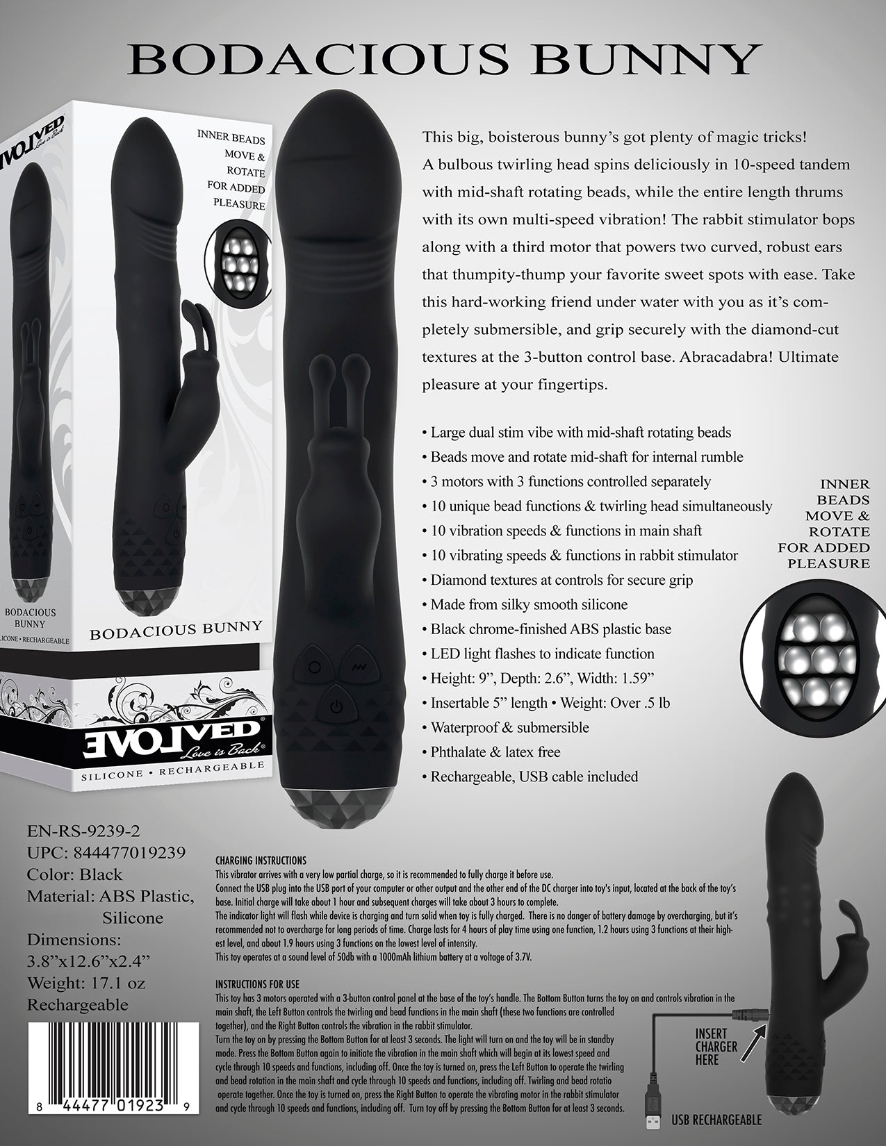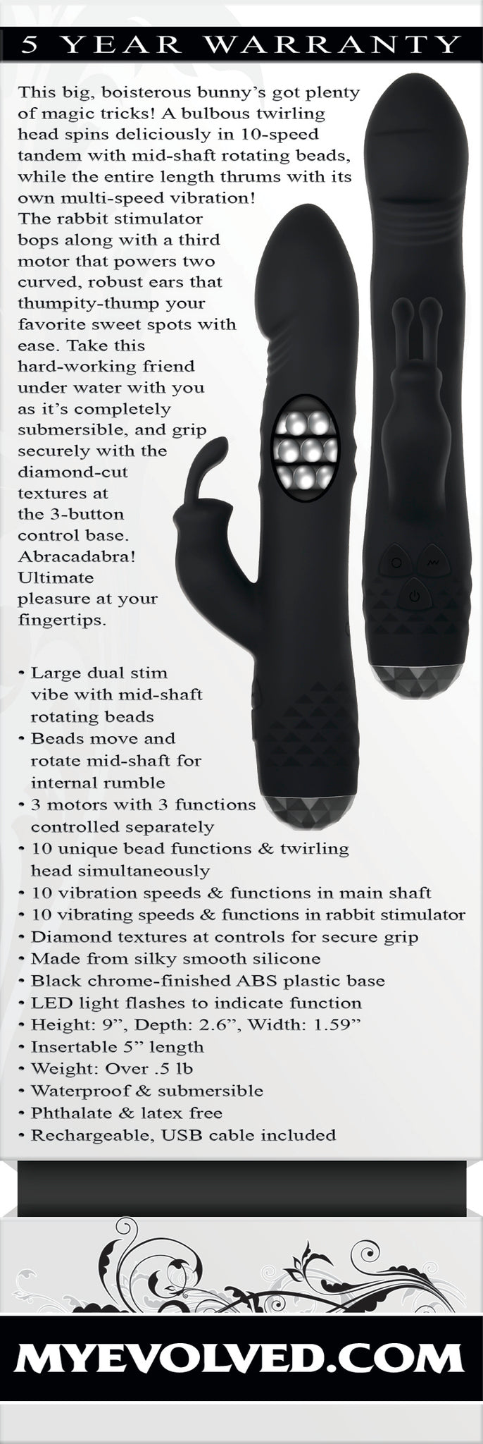 Features: large dual stim vibe with mid-shaft rotating beads. Beads move and rotate mid-shaft for internal rumble. 3 motors with 3 functions controlled separately. 10 unique bead functions and twirling head simultaneously. 10 vibration speeds and functions in main shaft. 10 vibrating speeds and functions in rabbit stimulator. Diamond textures at controls for secure grip. Made from silky smooth Silicone. Black chrome finished ABS plastic base. LED light flashes to indicate function. Size height 9 inches, depth 2.6 inches, width 1.59 inches. Insertable 5 inches in length. Weight over .5 pound. Waterproof vibrations and submersible for water play. Body safe phthalate free and latex free. Rechargeable vibrations, USB cable included. Categories: Rabbit Style Vibrators, Rechargeable Vibrators, Sex Toys for Couples, Men, Women, G-Spot Rabbit Style: 2023.