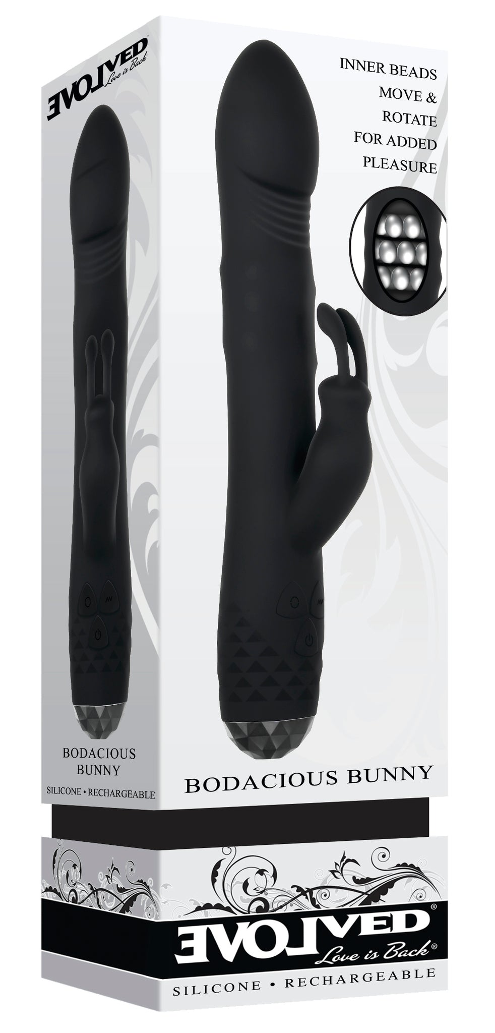 Bodacious Bunny Rabbit Style Vibrator from Evolved Novelties. This big, boisterous bunny’s got plenty of magic tricks! A bulbous twirling head spins deliciously in 10 speed tandem with mid-shaft rotating beads, while the entire length thrums with its own multi-speed vibration! The rabbit stimulator bops along with a third motor that powers two curved, robust ears that thumpity thump your favorite sweet spots with ease. Take this hard working friend under water with you as it’s completely submersible, and grip securely with the diamond cut textures at the 3 button control base. Abracadabra! Ultimate pleasure at your fingertips.