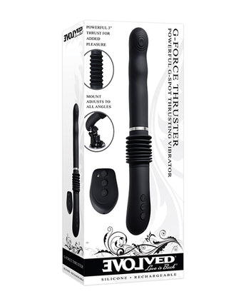 Evolved G-Force Thruster from Evolved Novelties. Take a wild ride on a powerful thrusting machine that rocks your G-Spot and leaves you thoroughly satisfied! Feel the earth moving vibrations deep inside your body as you groove to the circle textures against your G-Spot and relish the thrusting shaft that seems to have a mind of its own! Then to transform your experience into a hands free fantasy, simply click in the removeable suction mount and point it in any direction you desire, using the remote control to get the perfect combination of mind melting vibes and over 3 inches of thrust! Recharge both the adult toy and remote control with a secure USB connection to keep your sex machine ready for its next use! 7 vibrating speeds and functions. Powerful g-spot thrusting vibrator. 3 thrusting speeds. Over 3 inches of thrust. Remote controlled or manual. Mount adjust to all angles, push release to remove. 23 foot remote control range. Vibe length 12.5 width 1.44 inches, insertable 6 inches. Splashproof, not waterproof. 5 years warranty.