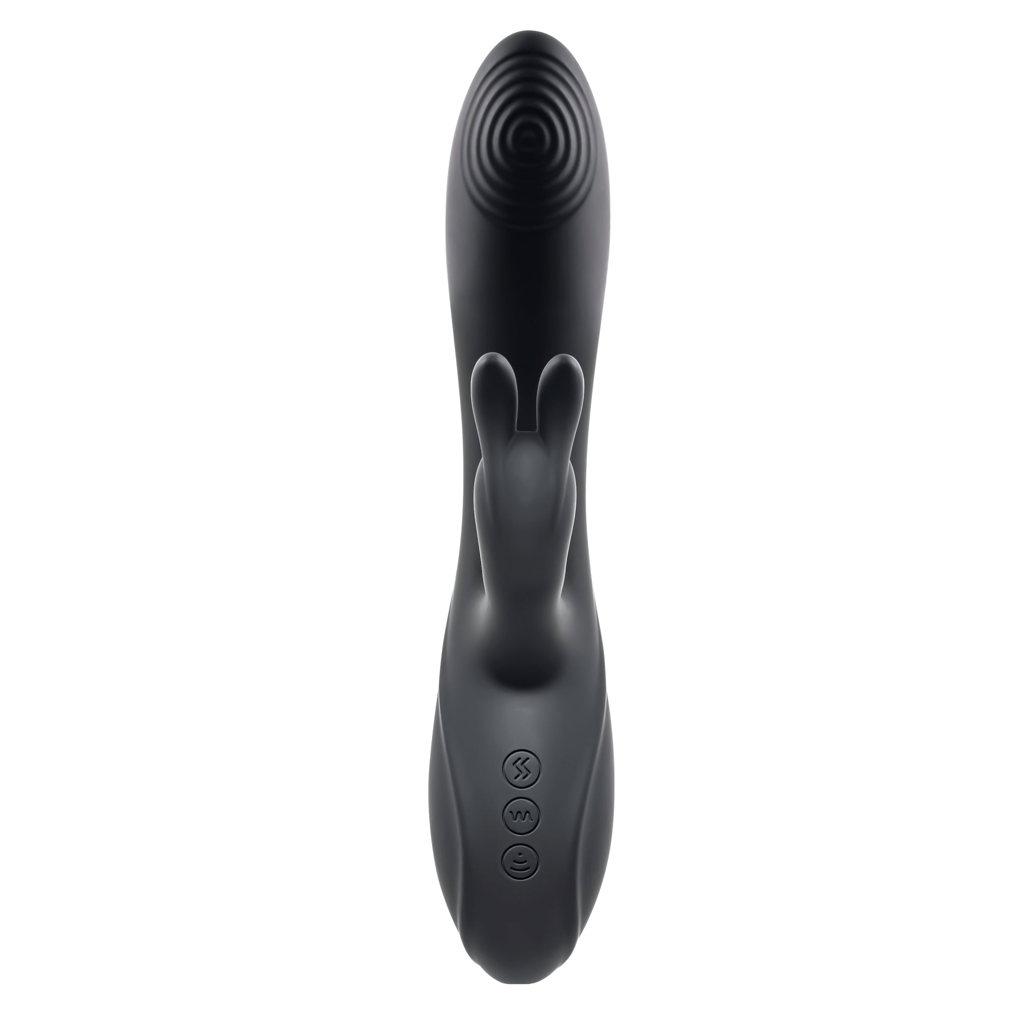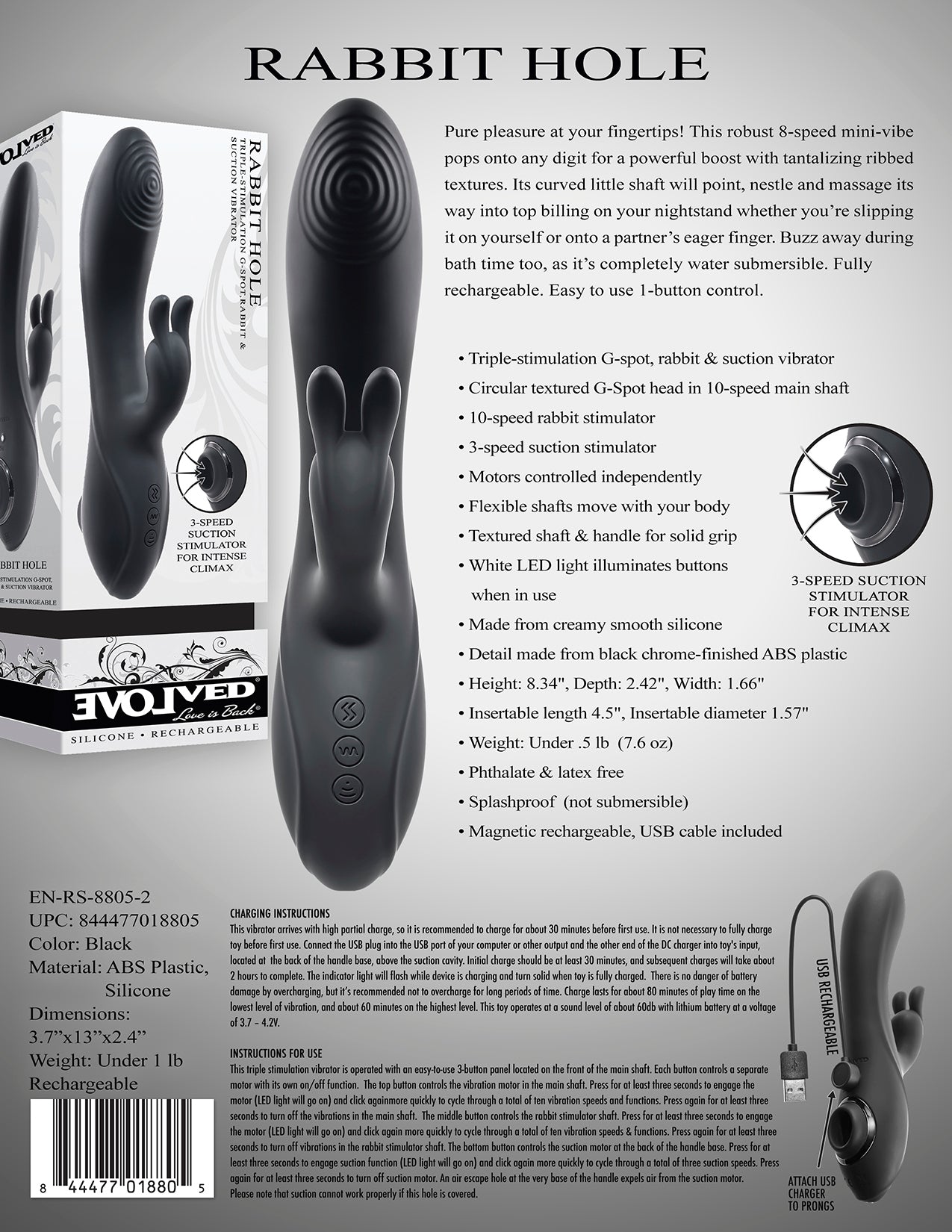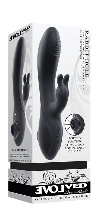 Evolved Rabbit Hole Black Vibrator from Evolved Novelties. This hard working triple threat adult toy delivers three powerful experiences in one elegant shape. The flexible 10 speed main shaft gently curves and swells to a G-Spot tip with circular textures at the head while the tireless 10 speed rabbit stimulator bops and bends with your body for intense stimulation. Flip the toy over for a glorious 3 speed suction sensation that pulls and teases, building to an erotic climax. Keep an easy grip with the textured handle and recharge magnetically via USB. Splashproof and easy to clean.