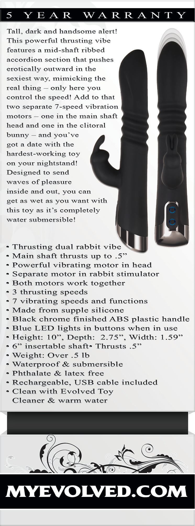 Evolved Rapid Rabbit Black Vibrator from Evolved Novelties. Thrusting dual vibrator. Main shaft thrust a half of an inch. Powerful vibrating motor in the head of the vibrator. Separate motor in the rabbit of the vibrator. Both motors work together. 3 thrusting speeds. 7 vibrating speeds and functions. Made of supple silicone. Black chrome finished ABS plastic handle. Blue LED light buttons when in use. Height 10 inches, depth 2.75 inches, width 1.59 inches. 6 inches insertable thrust .5 inch. Weight over a half a pound. Waterproof vibrations and submersible. Phthalate free, latex free. Rechargeable UBS included. Clean with Evolved Toy Cleaner and warm water. Body safe materials silicone shaft, rabbit. ABS plastic handle. 5 years warranty.