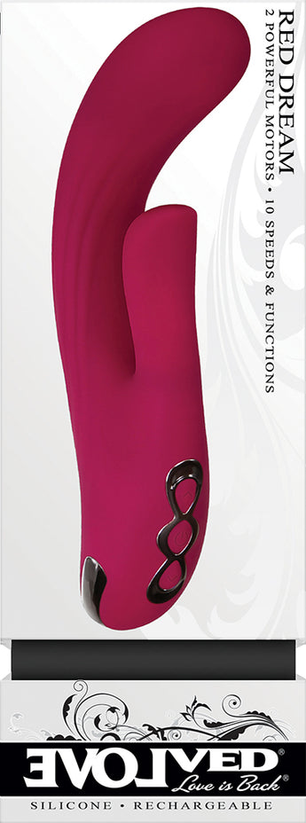 Red Dream Red Vibrator from Evolved Novelties. This dual vibe takes you on a curvaceous journey where the destination is pure pleasure! With two powerful motors that operate independently, you can customize your ride, even underwater as it’s completely submersible. Large and girthy, expect deep satisfaction from this flexible shape that moves with your body and lets you amp up to ten when you want it most. Clean with Evolved Toy Cleaner and a warm water rinse.