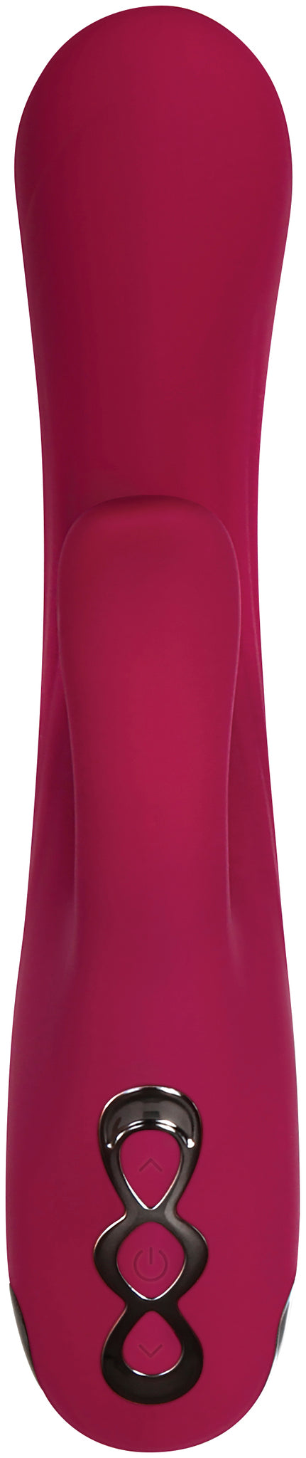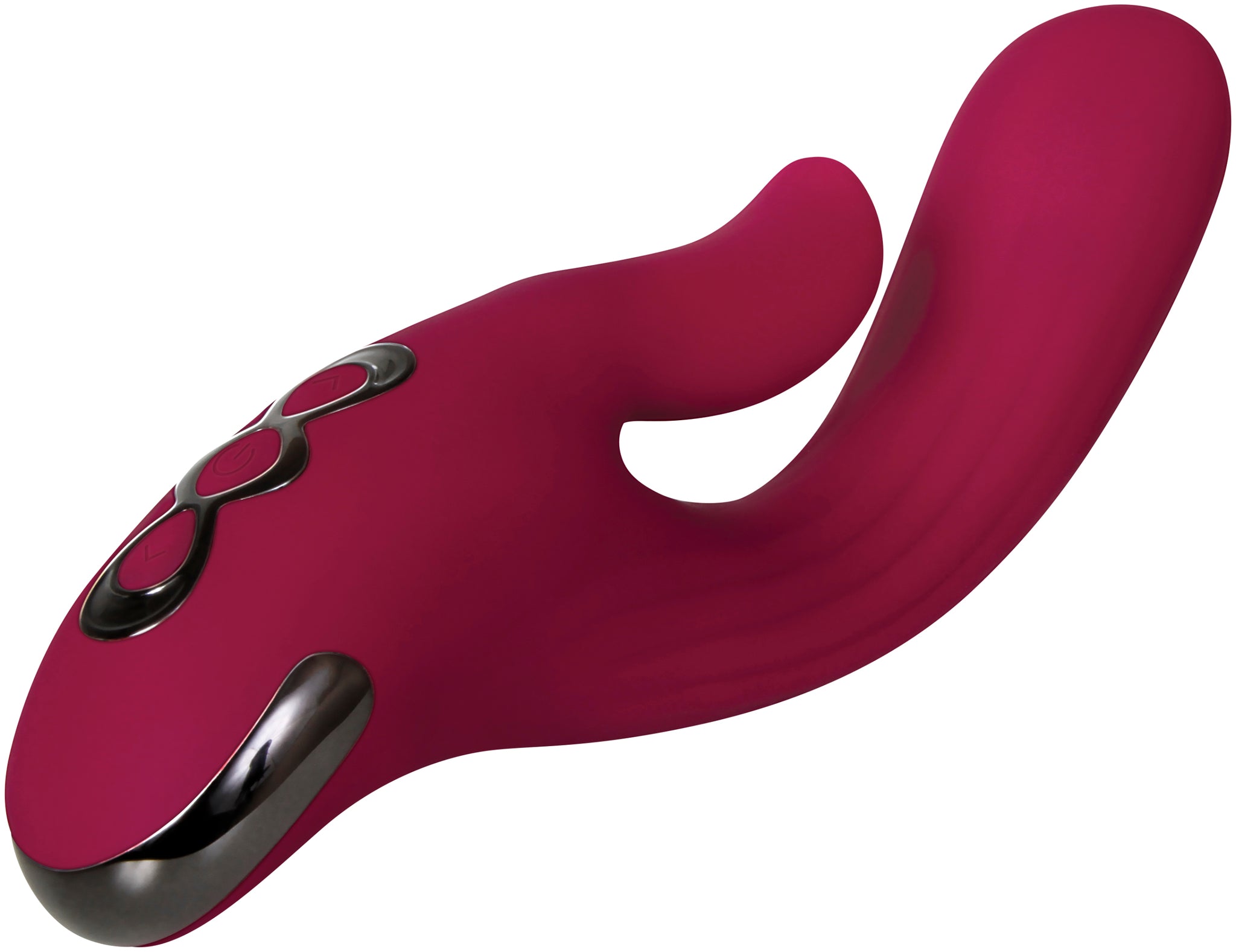 Features: curved flexible dual motor vibrator. Ideal for satisfying dual orgasms. 2 powerful motors controlled independently. 10 vibrating speeds and functions in each motor. Made from creamy smooth silicone. Control panel detail made from durable ABS plastic. Stylish black chrome finish on details. Textured shaft for added stimulation. LED light illuminates button when in use. Height 8.25 inches, depth 2.38 inches, width 1.59 inches. Weight 6.9 ounces. Waterproof vibrations and submersible. Phthalate free, latex free. Rechargeable, USB cable included. 5 years warranty from Evolved Novelties.
