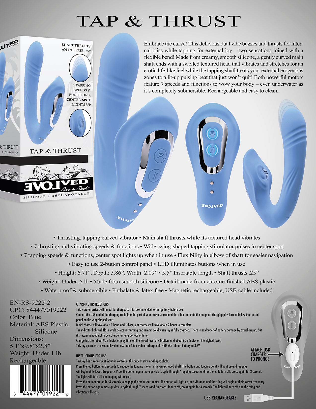 Evolved Tap and Thrust Dual Vibrator. Evolved Love Is Back. Embrace the curve! This delicious dual vibe buzzes and thrusts for internal bliss while tapping for external joy. Two sensations joined with a flexible bend! Made from creamy, smooth Silicone, a gently curved main shaft ends with a swelled textured head that vibrates and stretches for an erotic life like feel while the tapping shaft treats your external erogenous zones to a lit up pulsing beat that just will not quit! Both powerful motors feature 7 speeds and functions to wow your body, even underwater as vibrator is completely waterproof. Submersible for bath tub play. Size 6.7 inches in length, 5.5 inches insertion length. Rechargeable vibrations. Easy to clean. 5 years warranty. Categories: Sex Toys for Couples, Rechargeable Vibrators, Strap-Ons, Harnesses, Double Dongs. 2023.
