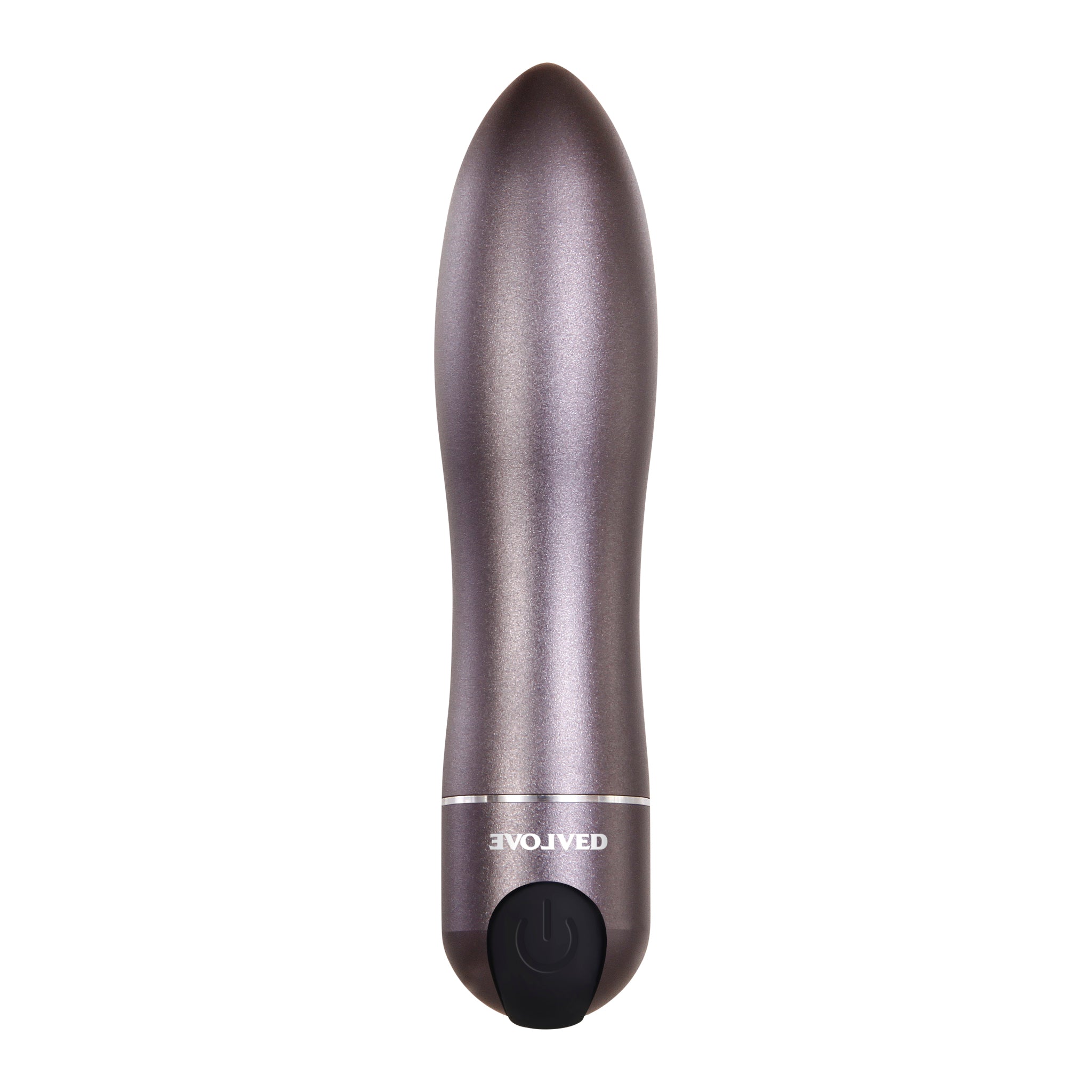 Evolved Travel-Gasm Bullet Vibrator. Powerful metal rechargeable bullet. Tucks into discreet black carrying case. Delivers intense orgasms. Perfect for travel. Made from light weight Aluminum. Chic gunmetal matte finish.Silicone button on the base. 10 vibrating functions. White LED luminates when in use. Bullet vibrator measures 2.46 inches in width by 3.6 inches in height by .85 inch in depth. Case 2.46 in width by 4.56 inches in height by 1.48 inches in depth. Waterproof USB rechargeable. Cable included. Categories: Bullets, Eggs Vibrators, Rechargeable Vibrators, Sex Toys for Women, Vibrating Bullets, Eggs. 2022.