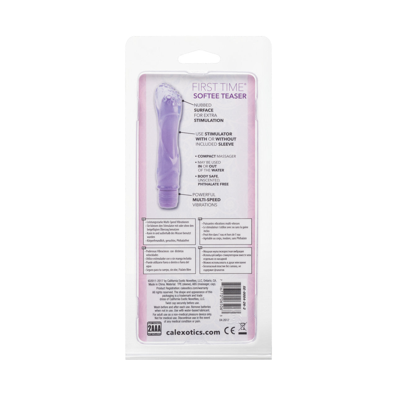 First Time Softee Teaser Purple G-Spot Vibe Pleasure Toy from California Exotic Novelties. Velvety soft pleasure products designed for first time or experienced users. he First Time Softee Teaser is designed for ultimate G-Spot stimulation and pleasure. The discreet and compact sized translucent vibe measures 5.25 inches by 1.5 inches. Vibrator is ideal for special intimate moments anytime, and anywhere. Slip it into your purse, and you hare always ready for fun. The massager is made from safe and durable ABS Plastic. Vibrator features a removable plushy soft, contoured Thermoplastic Elastomers TPE sleeve. The powerful, waterproof stimulator has a solid shaft and soft, wide angled tip. For intense tingles and unlimited ecstasy, the curved tip has soft, flexible nubs that can be used to arouse all of your erogenous zones. Let the multi-speed vibration function escalate your pleasure. Simply twist the end cap to control your level of intimate stimulation. Use a quality lube for increased sensations and extended climax. The massager is safe to use in the bath or shower and can also be used to stimulate and relax any area of the body. Two AAA batteries are all that it takes to get the intimate party started. After play, always remember to clean the vibe to ensure it is in perfect condition for the next time. Clean with a toy spray cleaner or wash in warm, soapy water. Pat dry before storing. Make it a memorable experience with the First Time Collection! Velvety soft, power packed, and easy to use. Multiple speed vibrations. Vibrating sex toy requires 2 AAA batteries, not included. Made using phthalate free, non-toxic materials Thermoplastic Elastomers TPE Sleeve, ABS Plastic Vibrator. Teaser G-Spot Vibe measures 5.25 inches long by 1.25 inches wide. Bulk weight 2.4 ounces. Softee Teaser G-Spot Vibe can safely be used to stimulate the G-Spot, P-Spot or prostate. Beginners sex toy. Always clean before and after use plus between partners. Remove batteries before storage to increase the life of all sex toys. First Time Power Vibes is a registered trademark for California Exotic Novelties. Categories: Vibrators, Classic Vibrators, Sex Toys for Women, Pleasure Toys, Straight Vibrators with Sleeves. 2023.