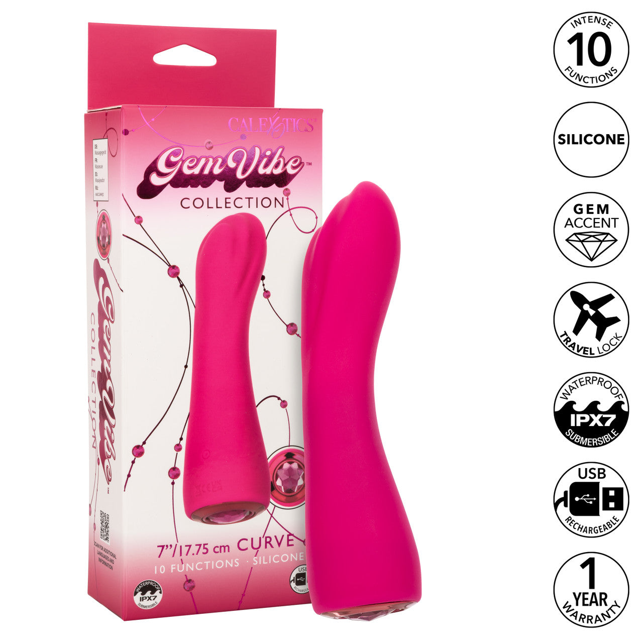 Gem Vibes Collection Glider Pink Vibrator from California Exotic Novelties. Step into a world where elegance meets ecstasy with the Gem Vibe Collection Glider. This luxurious toy is designed for those who crave a touch of glamour in their pleasure pursuits. The toy stands apart with its uniquely shaped tip, perfectly designed to enhance foreplay and escalate pleasure. It is a testament to the fine art of intimate exploration, offering an experience that is as visually stunning as it is sensually gratifying. The heart of the Glider's allure lies in its 10 intense functions of vibration, pulsation, and escalation. Each setting is an invitation to a new realm of pleasure, whether you desire a gentle flutter or a powerful wave, this toy responds to your every whim, providing personalized ecstasy at your fingertips. The sparkling gem inlaid controller is not just a feature; it's a statement, adding a touch of opulence to your every encounter. Crafted from body safe materials, it is 100% waterproof with an IPX7 rating, offering the freedom to indulge in your deepest desires wherever and whenever. The state of the art memory chip is a thoughtful addition, resuming on the last function used for seamless continuation in your pleasure journey. This feature ensures that your favorite settings are always just a touch away, ready to transport you back to moments of bliss. Designed with both pleasure and practicality in mind, the toy comes with a security travel lock feature, ensuring discretion during your adventures. USB rechargeable for convenience, it boasts a complete charge in just 1.5 hours. With the capacity to run for 45 minutes on high speed and an impressive 100 minutes on low speed, the Gem Vibe Collection Glider is a companion in your journey of self discovery and indulgence, a jewel in the crown of your personal collection.