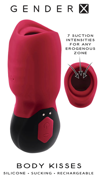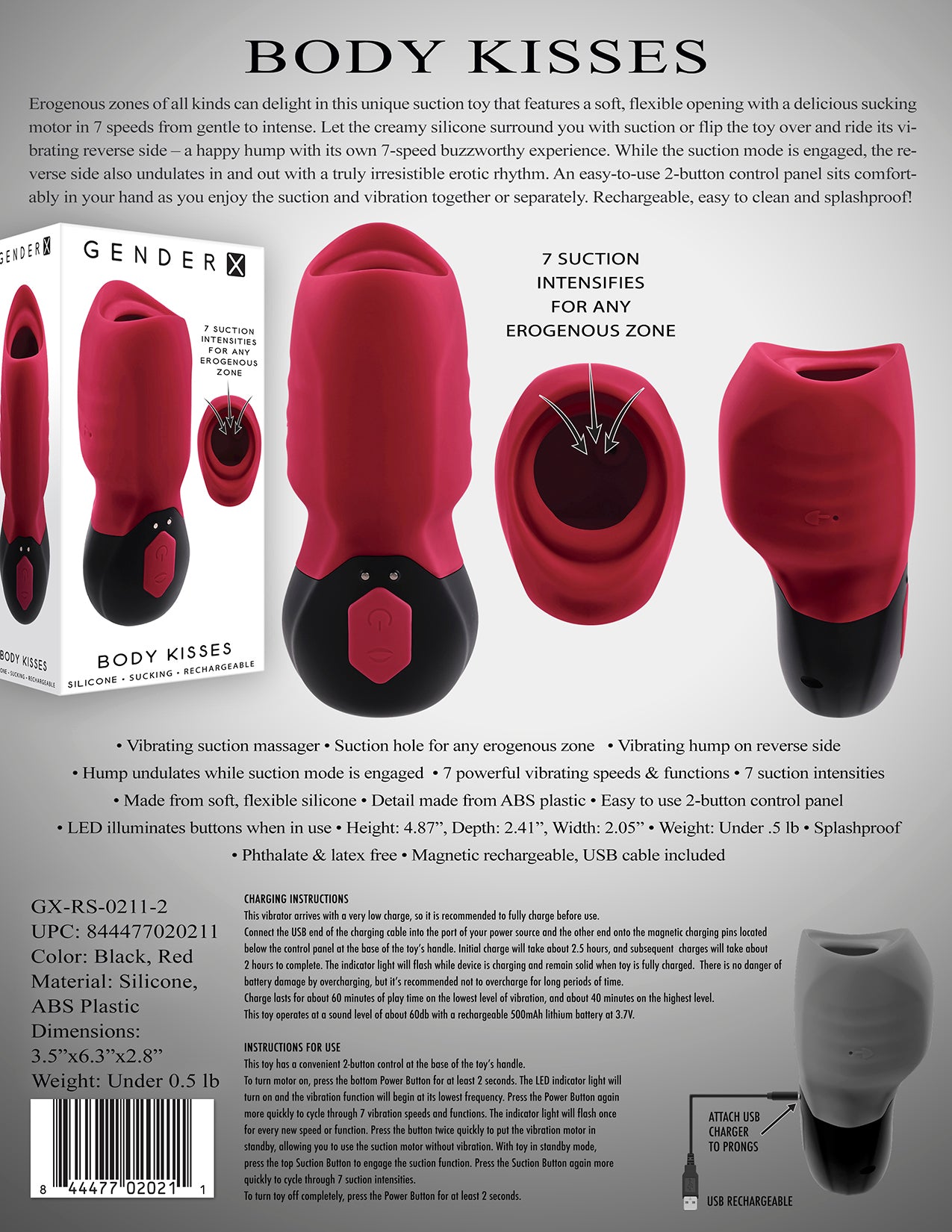 Gender X Body Kisses Vibrating Suction Massager from Evolved Novelties. Erogenous zones of all kinds can delight in this unique suction toy that features a soft, flexible opening with a delicious sucking motor in 7 speeds from gentle to intense. Let the creamy Silicone surround you with suction or flip the toy over and ride its vibrating reverse side, a happy hump with its own 7 speed buzz worthy experience. While the suction mode is engaged, the reverse side also undulates in and out with a truly irresistible erotic rhythm. An easy to use 2 button control panel sits comfortably in your hand as you enjoy the suction and vibration together or separately. Rechargeable, easy to clean and splashproof!