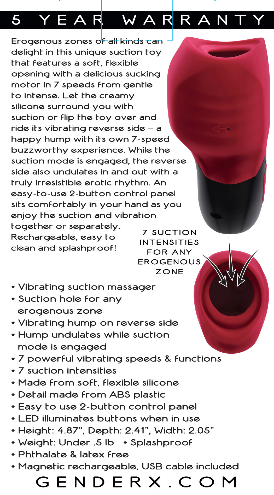Features: vibrating suction massager. Suction hole for any erogenous zone. Vibrating hump on reverse side. Hump undulates while suction mode is engaged. 7 powerful vibrating speeds and functions. 7 suction intensities. Made from soft, flexible Silicone. Details made from ABS plastic. Easy to use 2 button control panel. Light emitting diode LED illuminates buttons when in use. Size height 4.87 inches, depth 2.41 inches, width 2.05 inches. Bulk weight under .5 pound. Splashproof for easy cleaning and for shower play. Made using body safe materials that are phthalate free and latex free. Magnetic rechargeable, USB cable included. 5 years warranty. Categories: Male Masturbators, Vibrators, Rechargeable Vibrators, Masturbators. 2023.