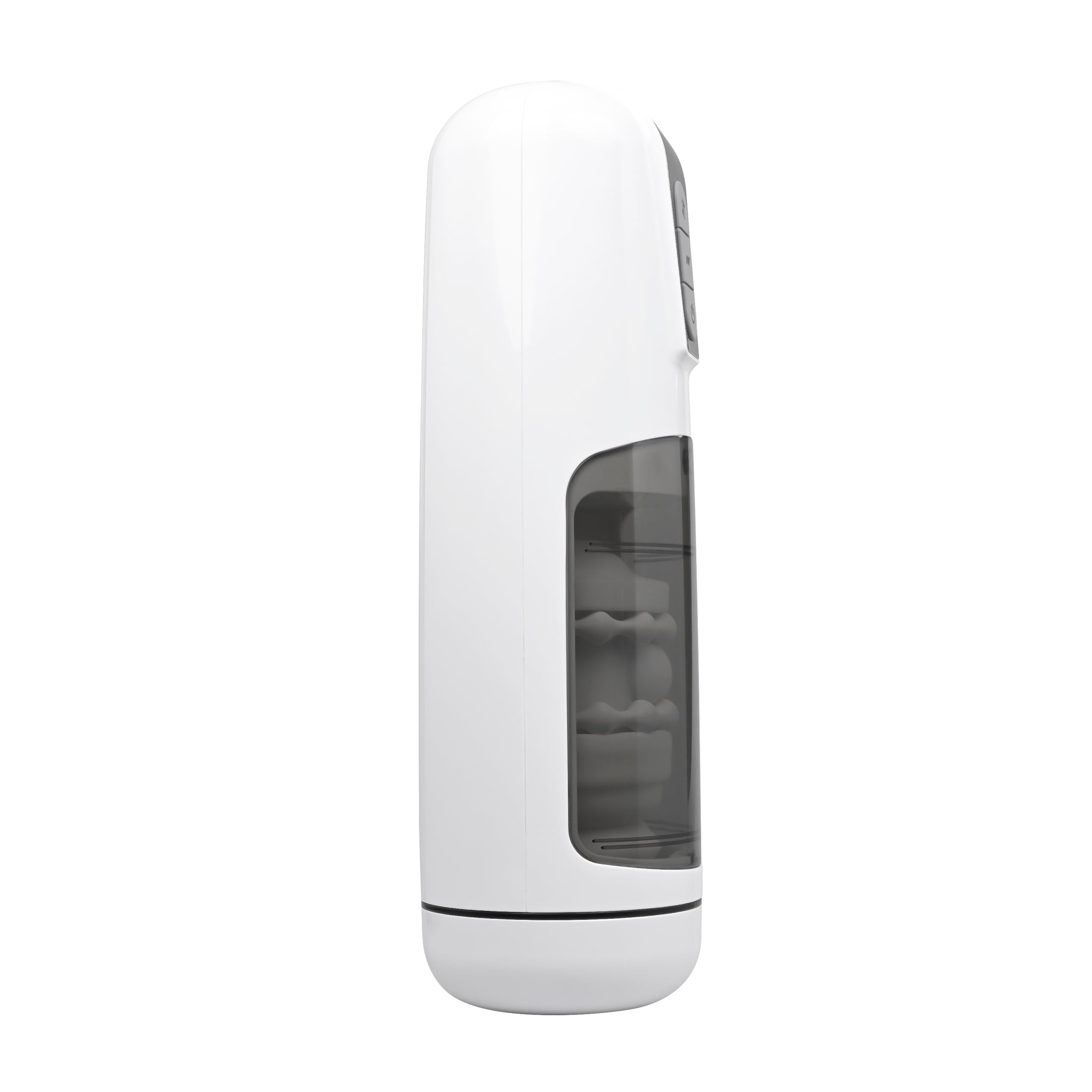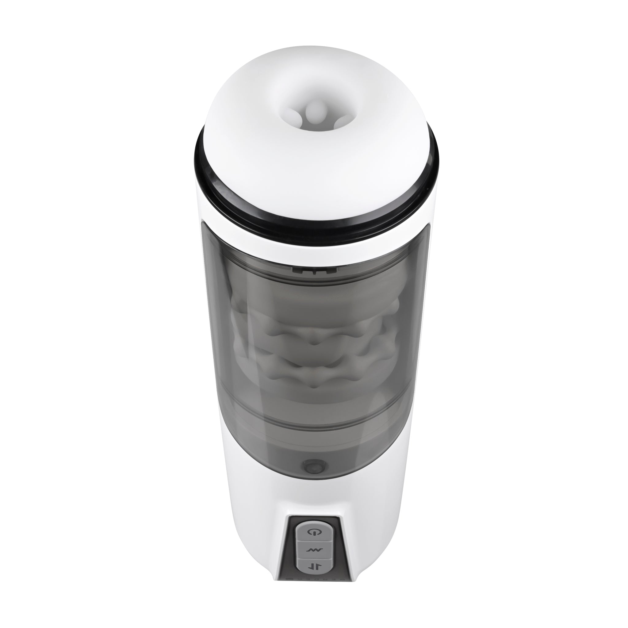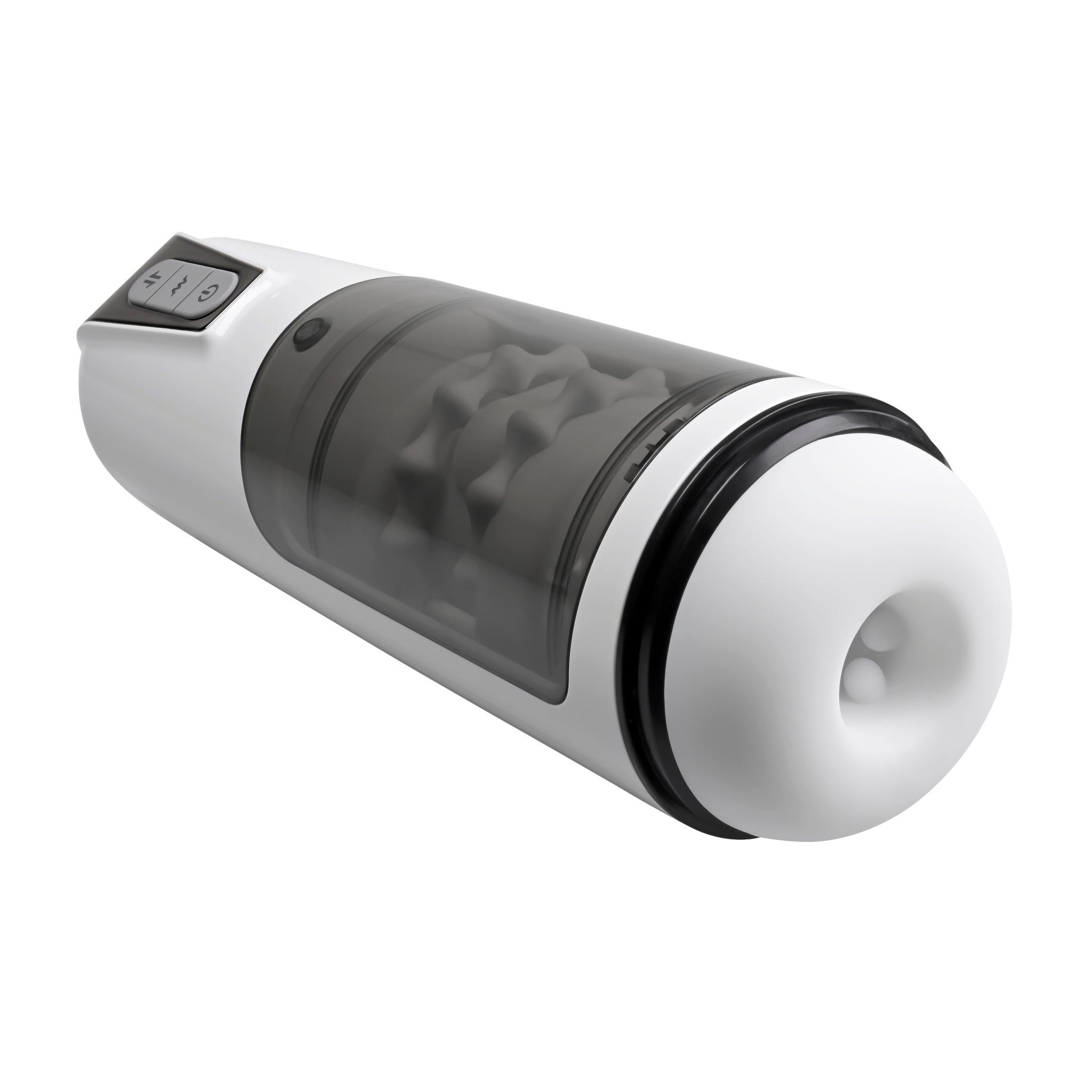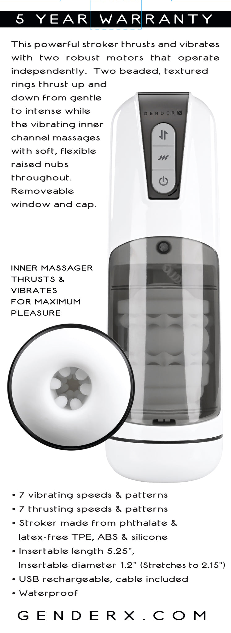 This powerful stroker thrusts and vibrates with two robust motors that operate independently. Two beaded, textured rings thrust up and down from gentle to intense while the vibrating inner channel massages with soft, flexible raised nubs throughout. Removeable window and cap. Details: 7 vibrating speeds and patterns. 7 thrusting speeds and patterns. Stroker made is from body safe phthalate free and latex free Thermoplastic Elastomers TPE, ABS Plastic and Silicone. Size is insertable length 5.25 inches, insertable diameter 1.2 inches. Stretches to 2.15 inches. USB Rechargeable, cable included. Waterproof. Categories: Male Masturbators, Vibrators, Sex Toys for Men, Eco-Friendly Sex Toys, Rechargeable Vibrators, Strokers, Masturbators. 2024.