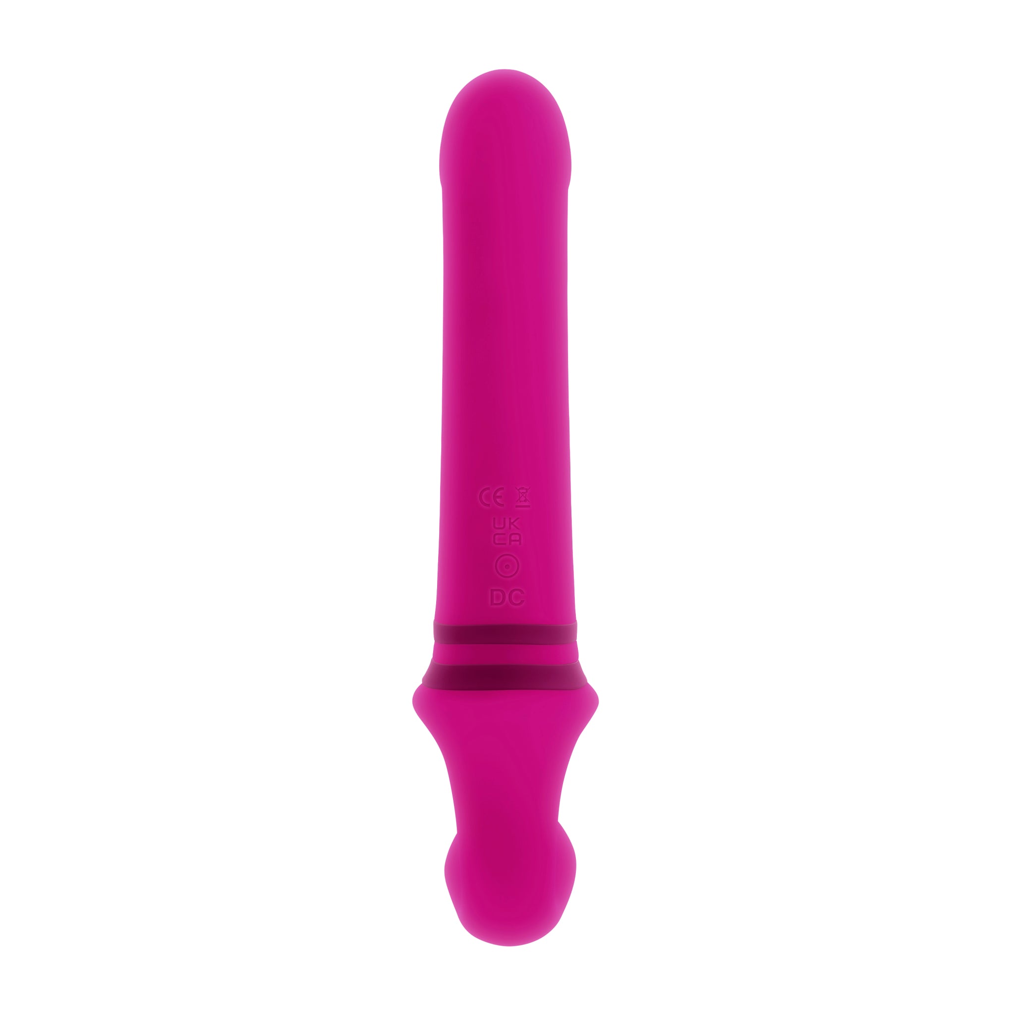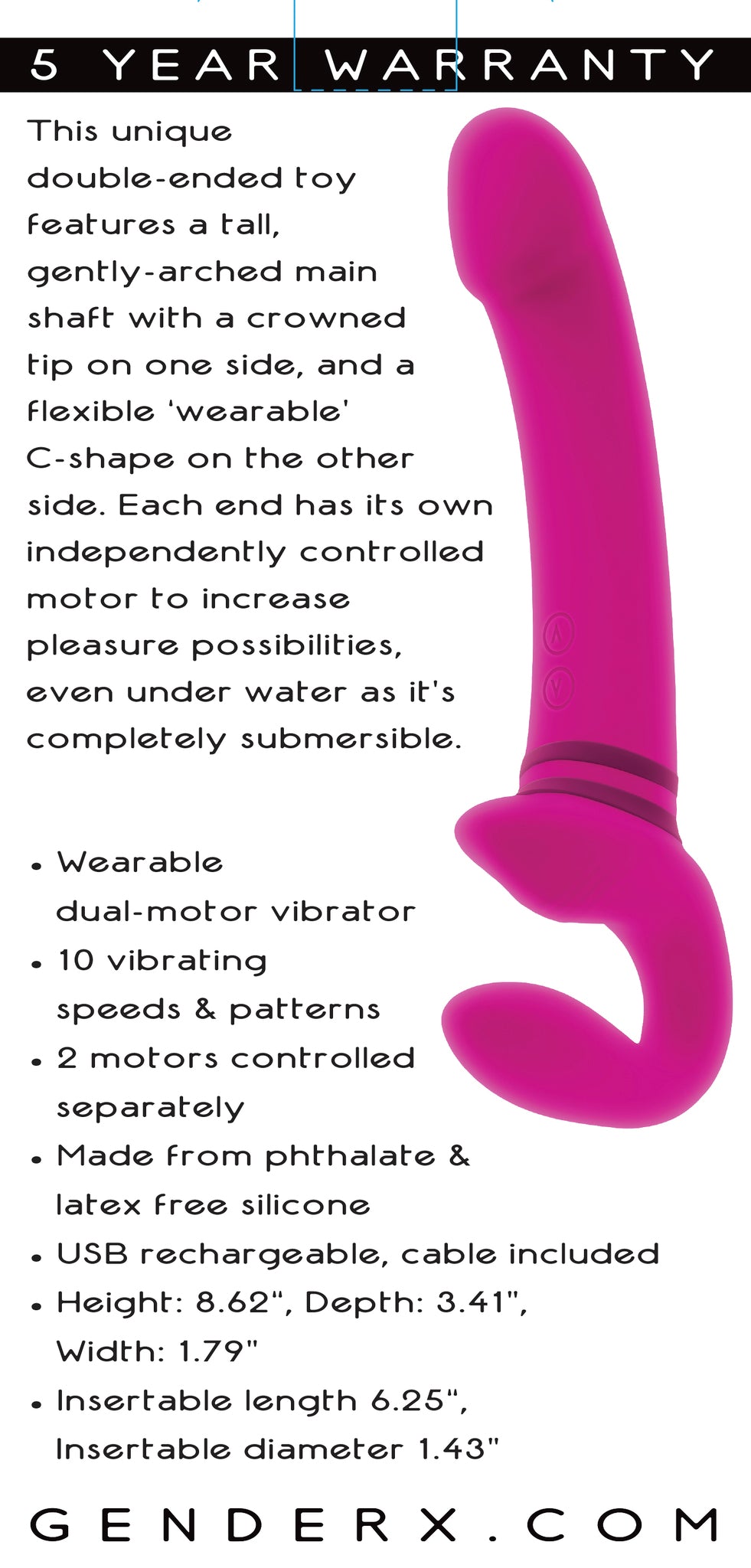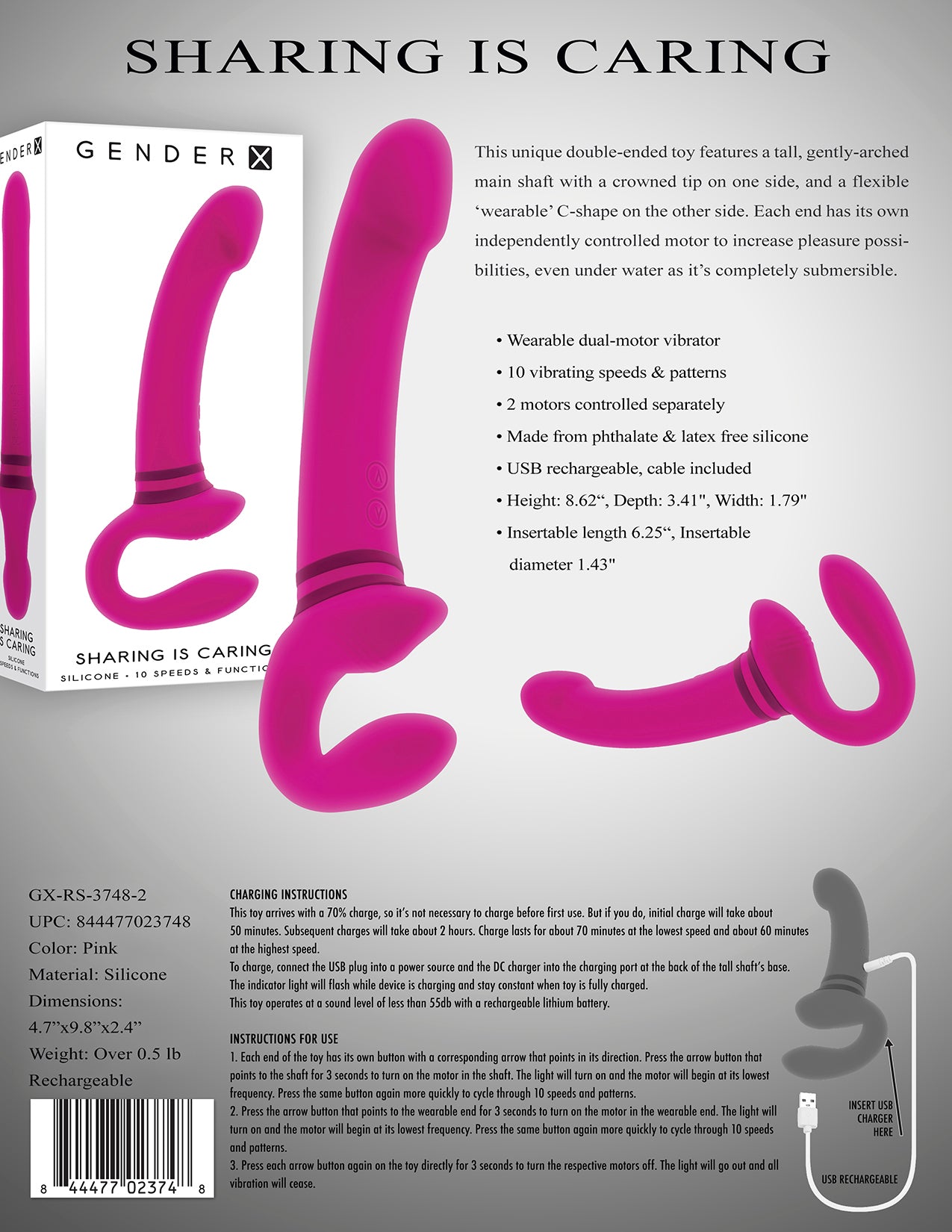 Gender X Sharing Is Caring Wearable Strapless Strap On from Evolved Novelties. This unique double ended Sex Toy features a tall, gently arched main shaft with a crowned tip on one side, and a flexible wearable C-Shape on the other side. Each end has its own independently controlled motor to increase pleasure possibilities, even underwater as it is completely submersible.
