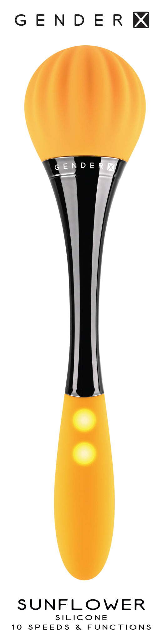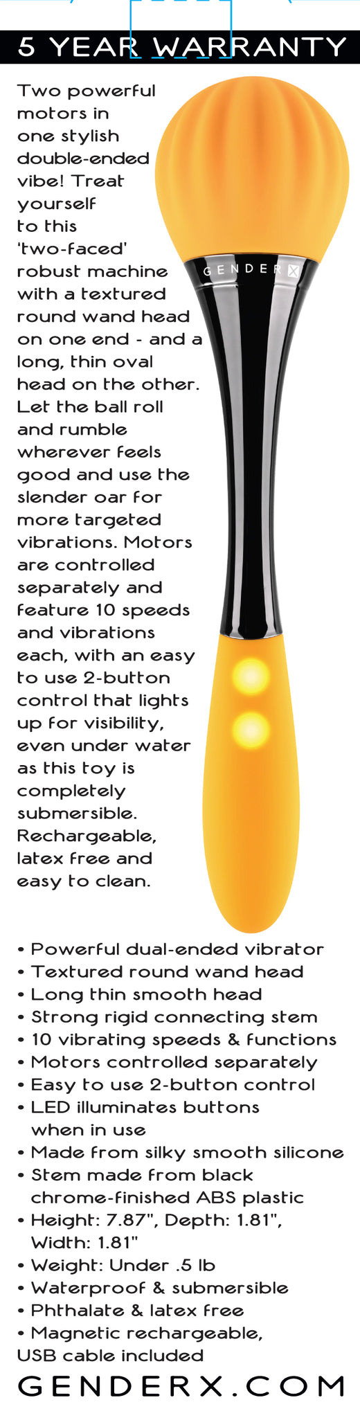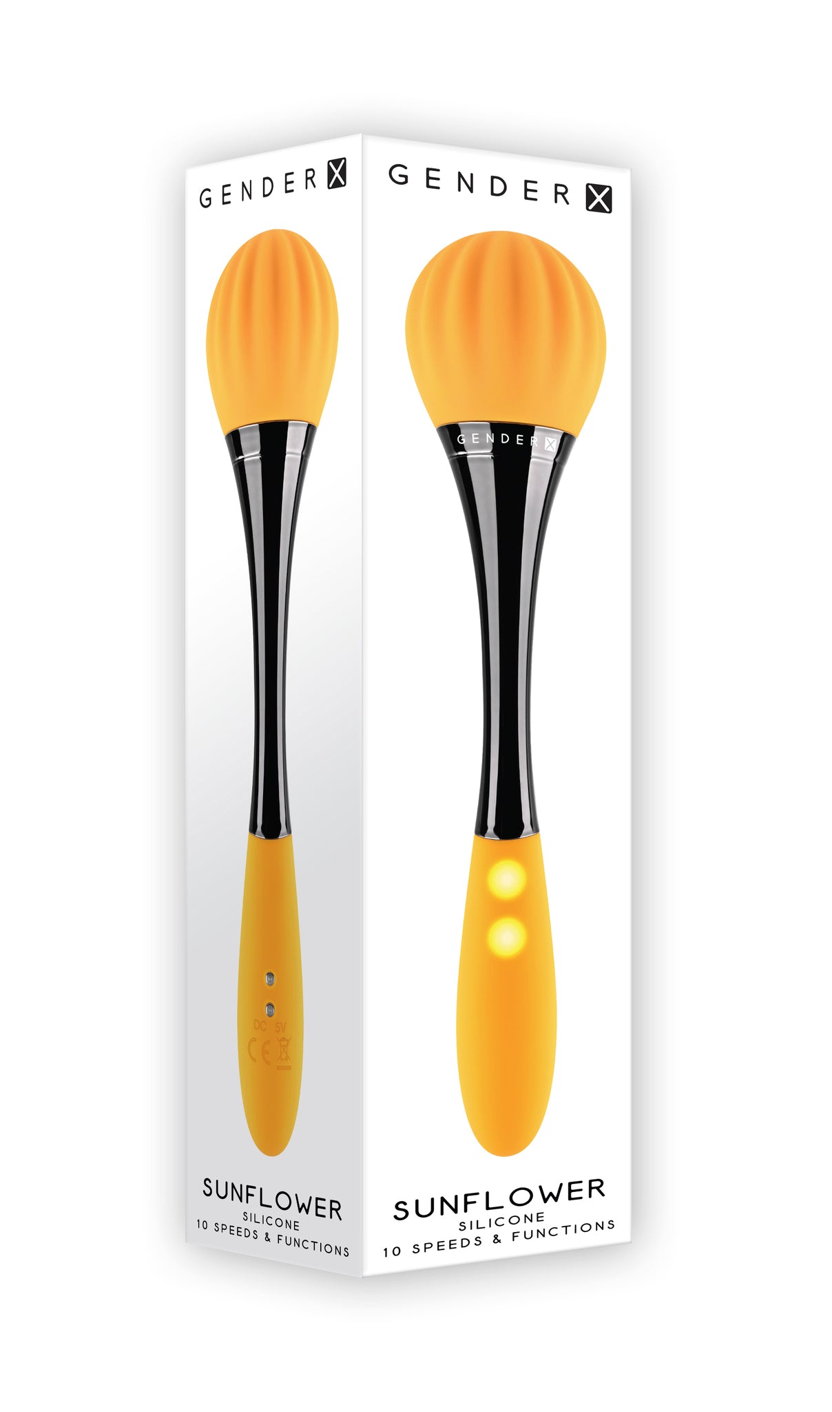 Gender X Sunflower Double Vibrator from Evolved Novelties. Two powerful motors in one stylish double ended vibe! Treat yourself to this two faced robust machine with a textured round wand head on one end and a long, thin oval head on the other. Let the ball roll and rumble wherever feels good and use the slender oar for more targeted vibrations. Motors are controlled separately and feature 10 speeds and vibrations each, with an easy to use 2 button control that lights up for visibility, even under water as this toy is completely submersible. Rechargeable, latex free and easy to clean.