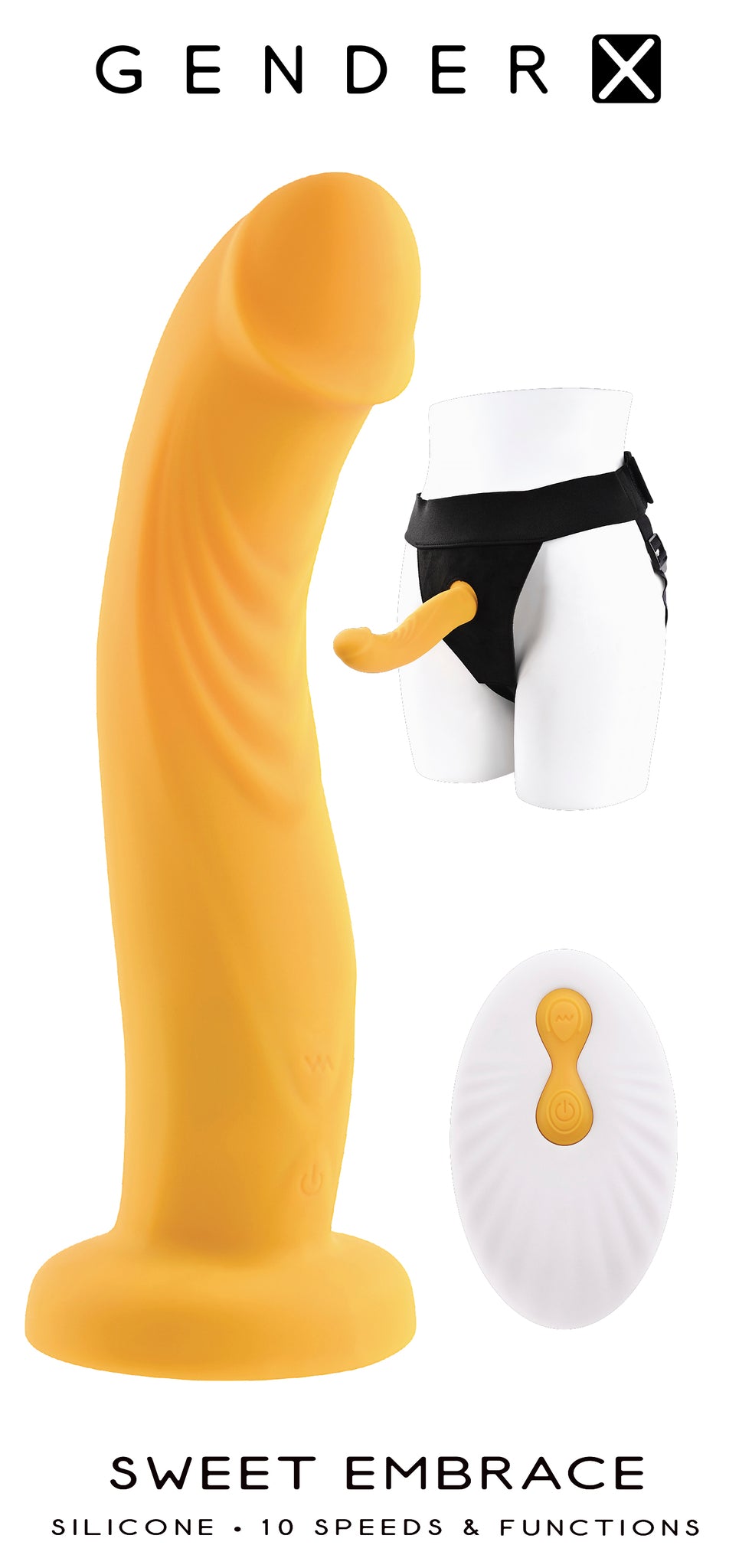 Gender X Sweet Embrace Strap On from Evolved Novelties. Two powerful motors in one strap on experience means more pleasure for everyone! This gently curved vibe shaft with a crowned head has two robust motors controlled separately: one in the head and one in the base. Slip the vibe inside the harness for a comfy secure fit and focus on wearable fun! Use the remote control for hands free or partner play and take your adventures under water if you desire as it is completely submersible for bathtub play. Rechargeable, easy to clean and latex free!