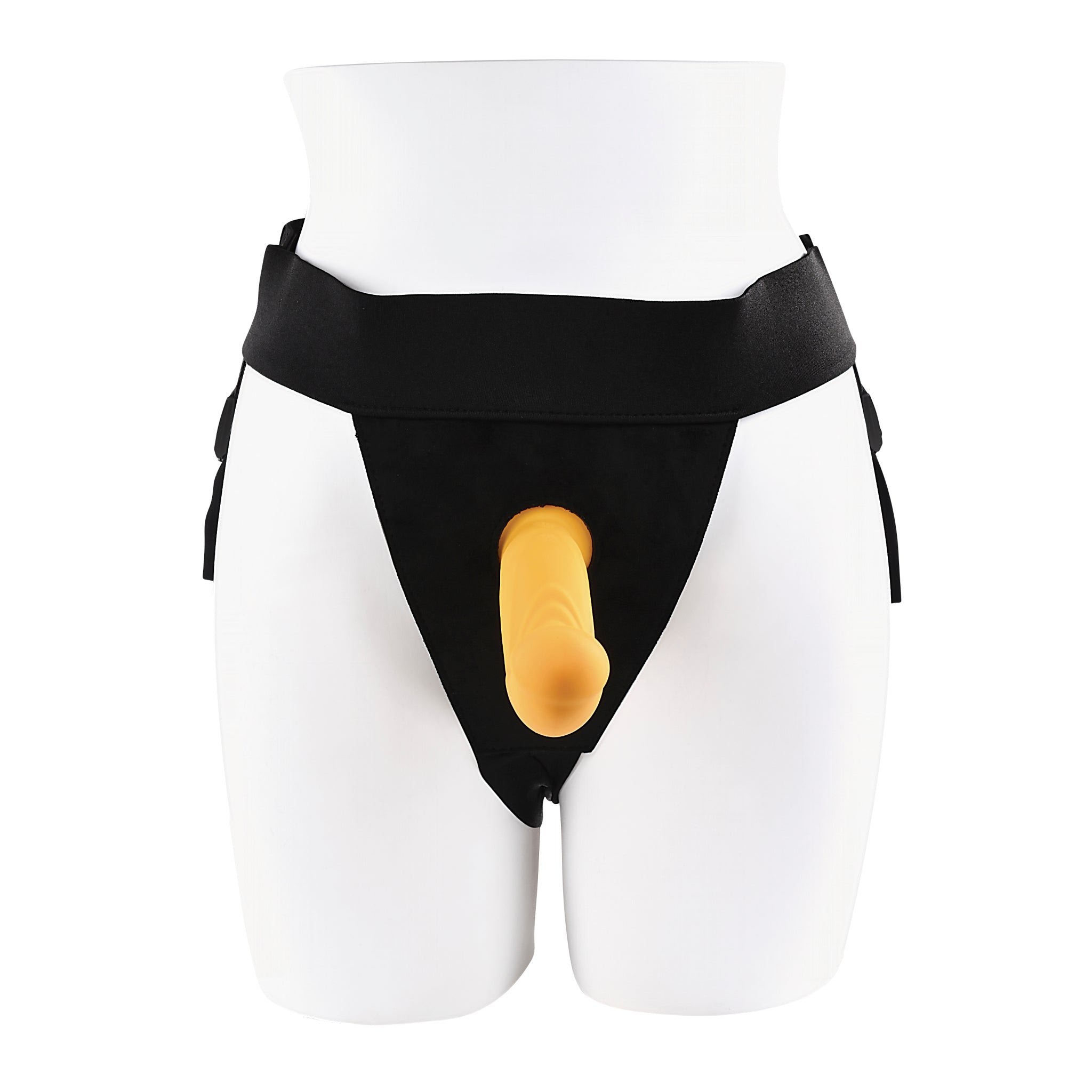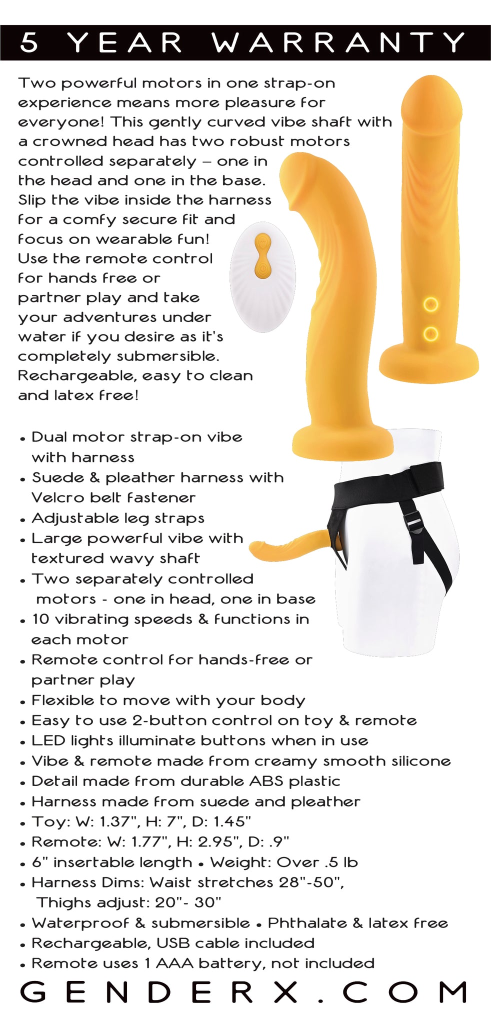 Specifications: dual motor strap on vibe with harness. Suede and pleather harness with Velcro belt fastener. Adjustable leg straps. Large powerful vibe with textured wavy shaft. Two separately controlled motors: one in head, one in base. 10 vibrating speeds and functions in each motor. Remote control for hands free or partner play. Flexible to move with your body. Easy to use 2 button control on adult toy and remote control. Light emitting diode LED lights illuminate buttons when in use. Vibe and remote control made from creamy smooth Silicone. Detail made from durable ABS plastic. Harness made from suede and pleather faux leather. Adult toy height 7 inches, depth 1.45 inches, width 1.37 inches. Remote control height 2.95 inches, depth .9 inch, width 1.77 inches. 6 inches insertable length. Bulk weight a little over a half a pound, .5 pound. One size fits most. Harness dimensions: waist stretches 28 inches to 50 inches, thigh straps adjust 20 inches to 30 inches. Waterproof and submersible vibrations for play outside the bedroom. Made using body safe materials both phthalate free and latex free. Rechargeable via USB cord, cable included. Remote control uses 1 AAA battery, not included. 5 years warranty. Categories: Rechargeable Vibrators, Strap Ons, Harnesses, Sex Toys for Women, Body Harnesses. 2023.