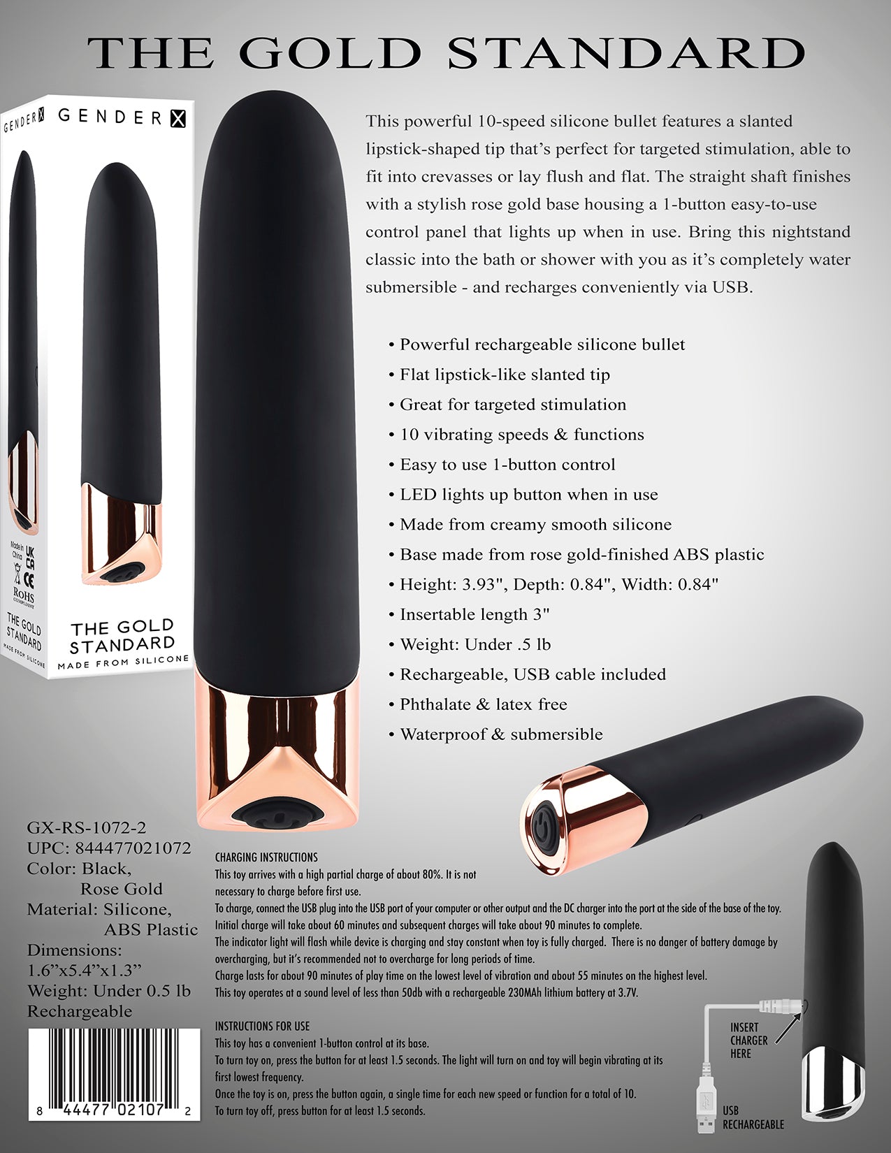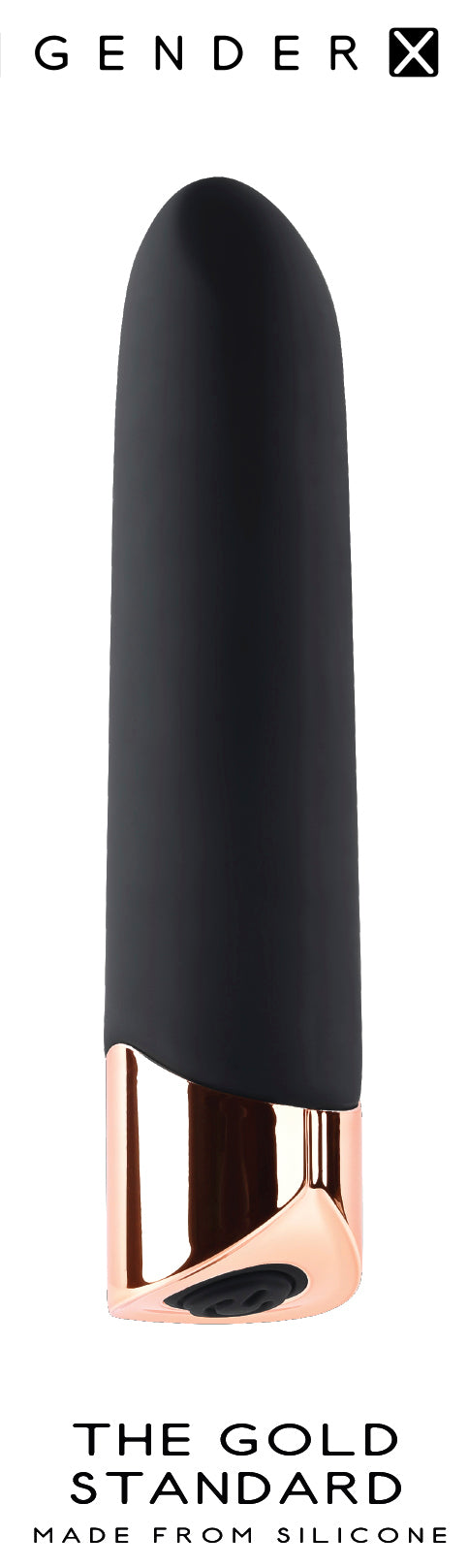 Gender X The Gold Standard from Evolved Novelties. This powerful 10 speed Silicone bullet features a slanted lipstick shaped tip that is perfect for targeted stimulation, able to fit into crevasses or lay flush and flat. The straight shaft finishes with a stylish rose gold base housing a 1 button easy to use control panel that lights up when in use. Bring this night stand classic into the bath or shower with you as it is completely water submersible and recharges conveniently via USB.