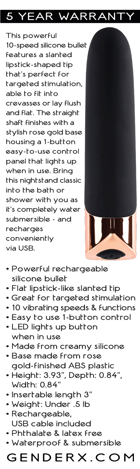 Features: powerful rechargeable Silicone bullet. Flat lipstick like slanted tip. Great for targeted stimulation. 10 vibrating speeds and functions. Easy to use 1 button control. Light Emitting Diode LED lights up button when in use. Made from creamy smooth Silicone. Base made from rose gold finished ABS plastic. Size height 3.93 inches, depth 0.84 inch, width 0.84 inch. Insertable length 3 inches. Bulk weight under half a pound. Rechargeable, USB cable included. Phthalate free and latex free. Waterproof, submersible. Categories: Bullets, Eggs, Rechargeable Vibrators, Sex Toys for Women, Vibrating Bullets and Eggs. 2023.