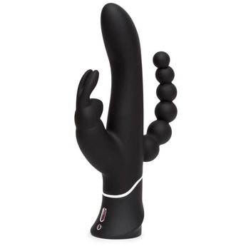 Happy Rabbit Triple Curve Rechargeable Rabbit Style Vibrator Black from Lovehoney the sexual happiness people. Reinvent your orgasms with triple the stimulation, thanks to this expertly designed, curved Rabbit Vibrator. 3 powerful motors are ready to wow you with all over stimulation and give you the biggest and best blended orgasms possible. Explore peak pleasure with 3 deliriously powerful motors, 9 intense functions in the ears and beads, and 12 powerful speeds and patterns in the shaft. Crafted from the highest quality velvety soft silicone, this USB rechargeable rabbit vibrator has been designed to target all of your hot spots. A thick, curved shaft delivers deep G-Spot massages while the beaded tickler and rabbit ears satisfy your other pleasure points for incredible blended orgasms. A whopping array of 21 vibration modes from 3 different motors provide unrivaled stimulation to your sweetest spots, yet despite this power, your happy rabbit remains whisper quiet. Not only a bedroom buddy, the rabbit's waterproof Silicone body means it is shower friendly and open to a dip in the tub at any time. Step up the stimulation by coating your rabbit with water based lubricant. Happy Rabbit Triple Curve vital function status ears and beads: 9 combinations shaft: 3 speeds, 9 patterns. Categories: Rabbit Style Vibrators, Rechargeable Vibrators, Sex Toys for Women, G-Spot Rabbit Style. Restricted, Amazon Restricted. 2023.