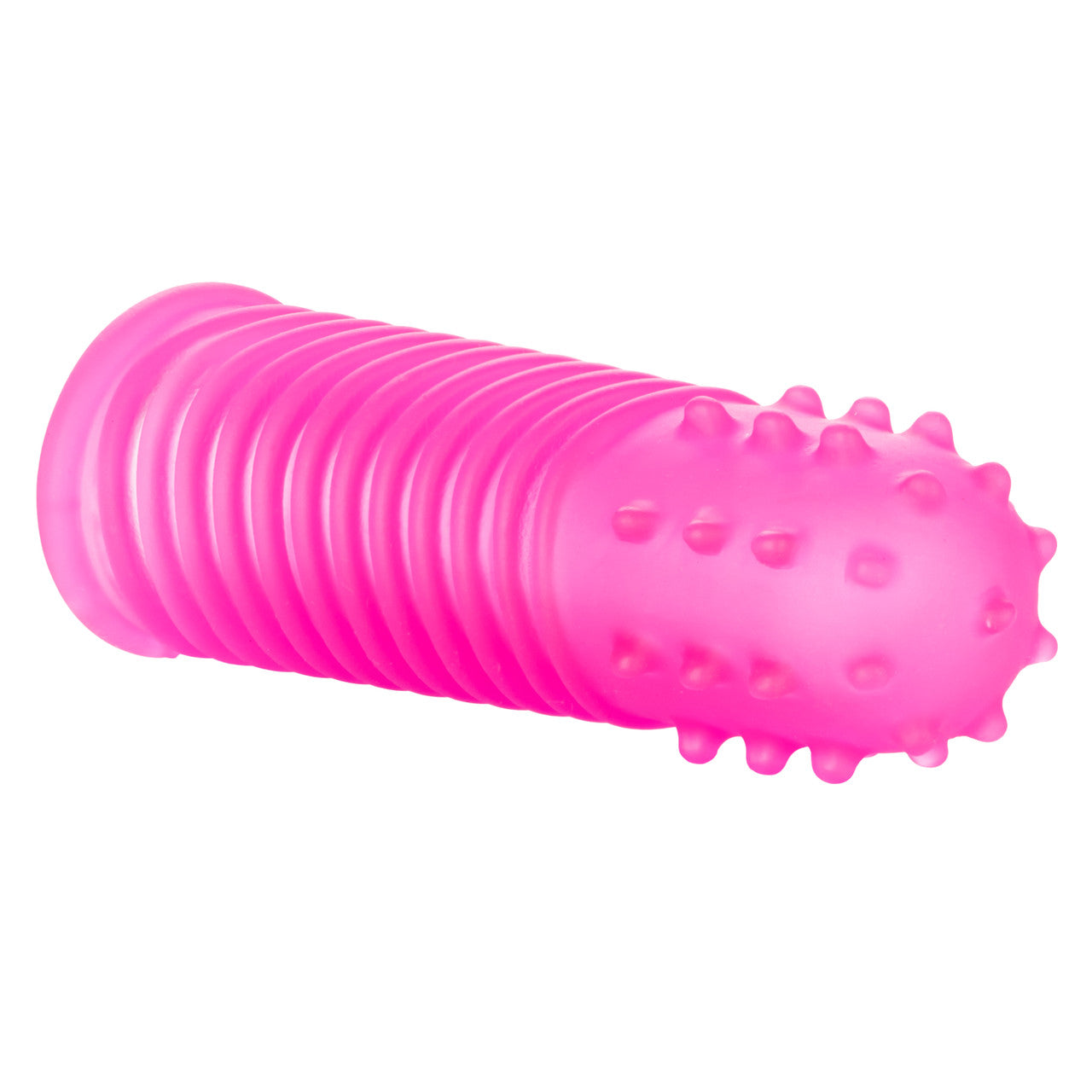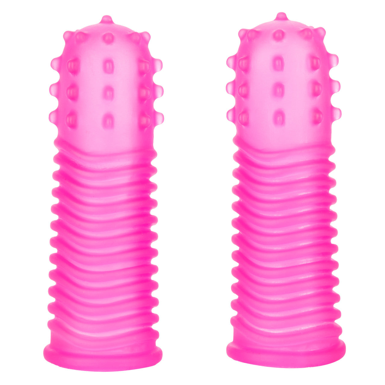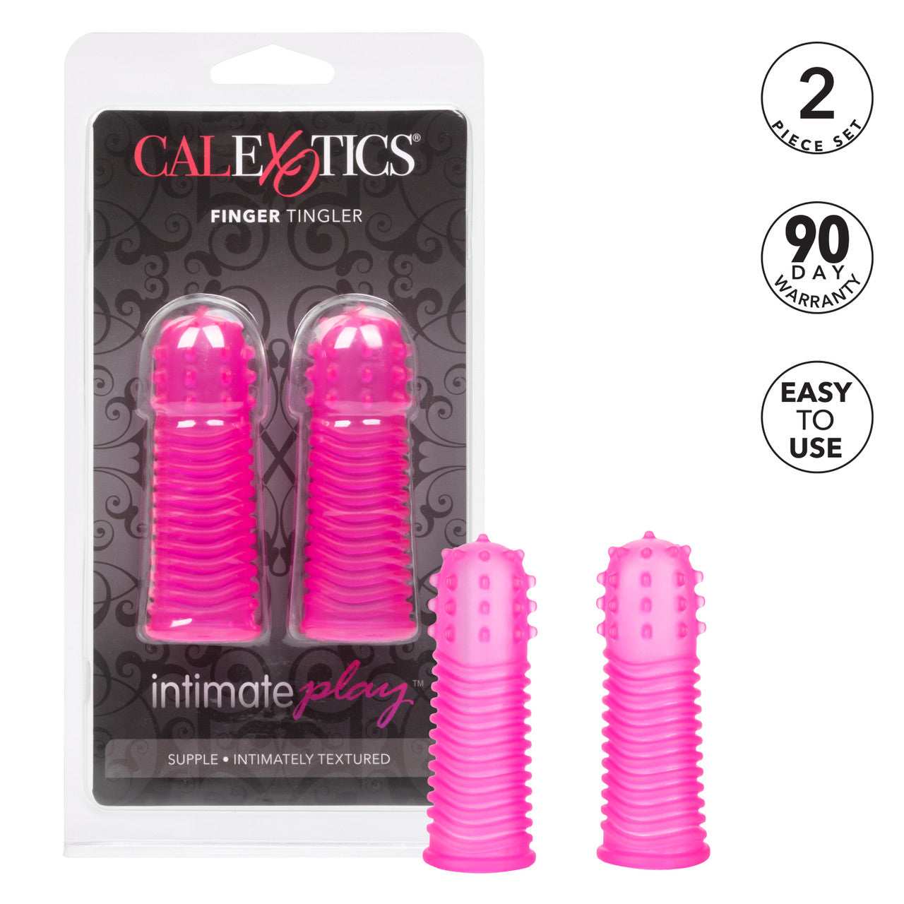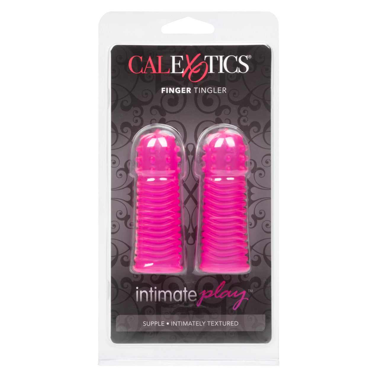 Intimate Play Finger Tingler Pink from California Exotic Novelties. Bring back the art of foreplay with the teasing Intimate Play Finger Tinglers. This set of 2 flexible ribbed teaser easily slide onto fingers to tease and tantalize sensual sweet spots. From the teasing nubs to the ravishing ripples, these flexible teasers are made to deliver seductive stimulation. These travel ready teasers are the perfect toys to bring on any vacation or a thrilling way to spice things up in the bedroom. 2 piece set. Sensual ridges for intense pleasure. Perfectly sized for endless possibilities. Materials PVC, Plastic.