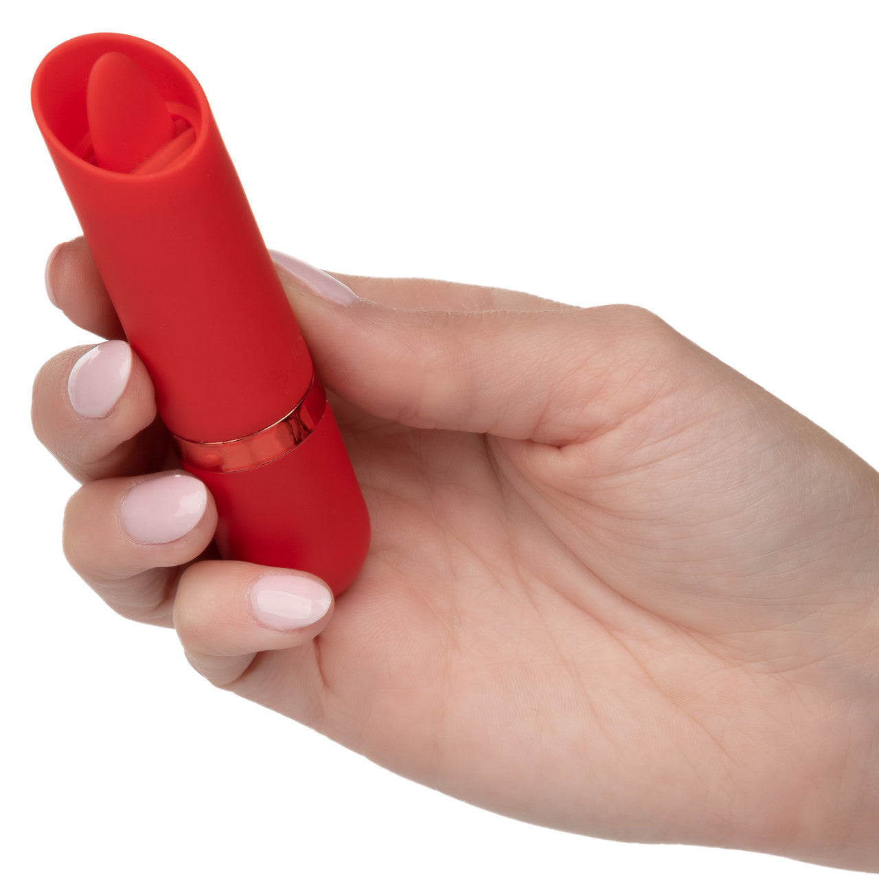 Kyst Flicker Red Tongue Vibrator from California Exotic Novelties. No matter where your travels take you, enjoy a little me time with the Kyst Flicker Mini Massager. The powerful Mini Silicone Bullet Vibrator is packed with 10 functions of vibration, a memory chip and a flickering tongue tip. The Mini Massager fits between your fingers to let you deliver pinpoint tantalization and thrill with rumbling vibrations and a Flickering Tongue. Get playful while you cycle through 10 indulgent vibration, pulsation and escalation functions with the easy touch control button. The ultra plush Silicone and Flickering Tip are great for exploring sensual sweet spots and intimate pleasure points with ease. With a smooth shape and supple surface, you will be able to indulge in thrilling vibrations from any angle your desire. Charge up your passion in just 1.5 hours by plugging the provided USB cable into the self sealing charging port. Get playful with up to 80 minutes of intense vibrations with every charge. The slim Massager’s discreet 3.75 inches size makes it the perfect travel companion, letting you embrace radiating pleasure wherever your fantasies take you.