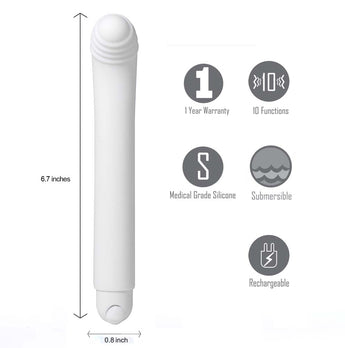 Misty Long Rechargeable Bullet Vibrator from Maia Toys. The Maia Novelties Misty is our long neck personal massager. The curved and ribbed head allow for targeted stimulation. Use Misty Bullet Vibrator as your own personal massager. Misty Bullet Vibrator can also be used as an intense G-Spot vibrator. Misty Bullet Vibrator provides intense power with its 10 vibrating functions. Misty Bullet Vibrator is coated in 100% body safe medical grade Silicone. Vibrator is waterproof for water play. The Misty Bullet Vibrator measures 6.7 inches in length. All our rechargeable products include our 1 year replacement Warranty. Vibrator is rechargeable and includes a USB charging cable. Vibrator features: long, slender neck for hard to reach areas. Curved, ribbed head for G-Spot stimulation. 10 powerful vibrating patterns. Color White.