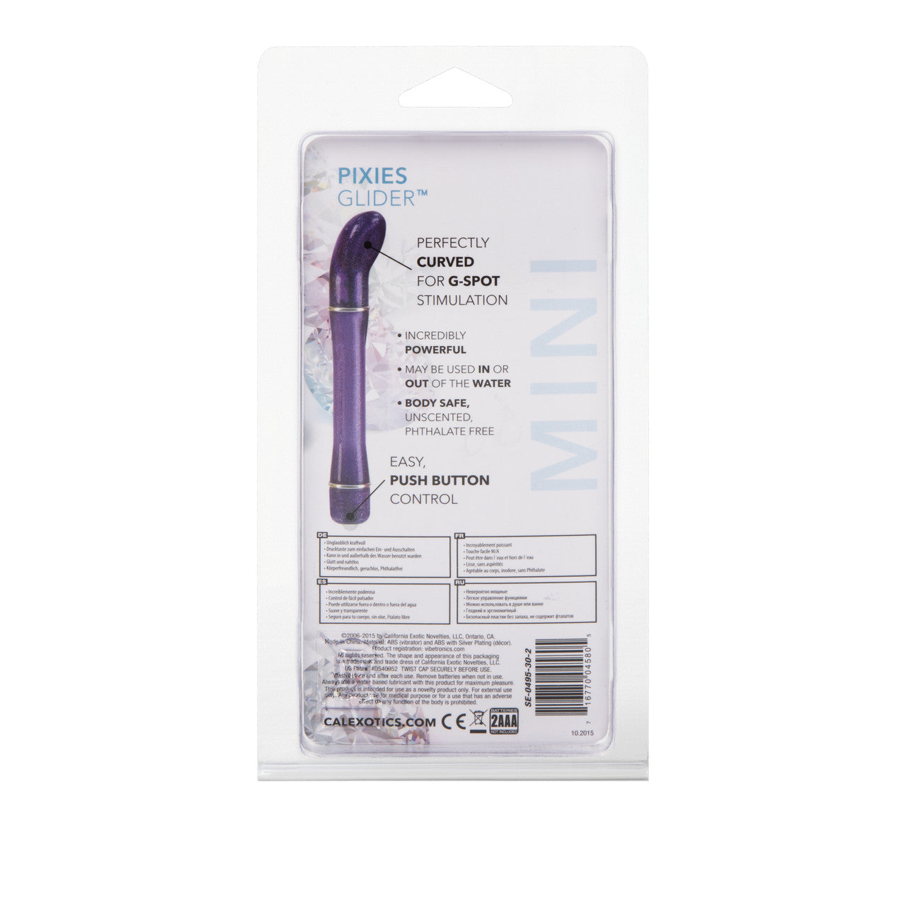 Waterproof Pixies Glider Purple from California Exotic Novelties. Hit just the right spot time with the Cal Exotics Pixies Glider Vibe. The beginner vibrator will be your discreet partner wherever you go; it is easily concealed in your purse or pocket for easy access. You will never be caught short again with this little sex toy. The power packed, petite vibrator comes with a sensually curved tip for an even more erotic experience. It measures an ideal 5 inches in length and 0.75 inch in width so you can confidently carry it without worry. Perfect for those wicked little pleasures! The curved tip allows you to stimulate your G-Spot for mind blowing orgasmic effects! This silent sex toy has an easy push button activation. No messing around with awkward dials or lots of different settings, just pop the button, and away you go. You will be cumming in seconds with this flawlessadult toy. With its unique tip, you can direct the vibration sensations to the most exact point on all your pleasure zones for maximum orgasmic effect! They recommend using the Pixies Glider Vibe with your favorite lubricant for a long lasting sensation. Power packed petite, waterproof vibrating massager glides across your body for precise pleasure. Made with durable and easy to clean plastic, this massager has a sparkling shimmer while the contoured shape supplies total stimulation.The large head is curved slightly and shaped like a spoon, with a smooth rounded-back and flat front. This flat front features a small divot to cradle the clitoris or nipples for tickling and teasing fun. Both sides of the head can be used for massaging pleasure and the wand like design makes it easy to control and grip. A single push button activation directs the vibrations and the waterproof construction makes it fun in the shower or bath. Safe and pure for body and pleasure. Made using phthalate free, non-toxic materials ABS Plastic. Vibrator measures 5 inches long by .75 inch wide. Requires 2 AAA batteries not included. Do not leave batteries in the vibrator between uses. A water based lubricant is recommended. Always clean before and after use. Category: For Women, Vibrator, Vibrators. Pixies Vibes hold the US Patent number D450952. Waterproof Pixies Glider Vibe is a registered trademark for California Exotic Novelties. Sex toys and sexual wellness. 1 year warranty. Categories: Vibrators, Classic Vibrators, Firm, Hard Vibrators, Sex Toys for Couples, Men, Women. 2023.