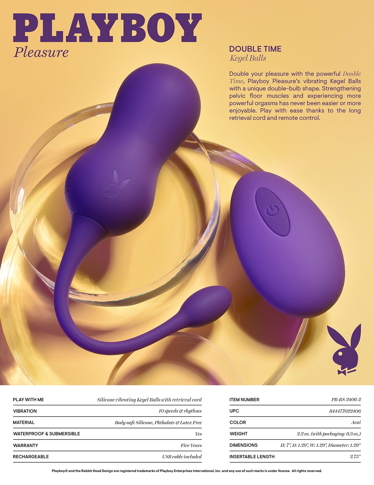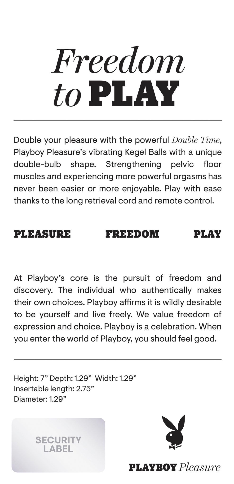Playboy Double Time Kegel Balls from Evolved Novelties. The freedom to play is yours with Playboy Pleasure. Double your pleasure with the powerful Double Time, Playboy Pleasure’s vibrating Kegel Balls with a unique double bulb shape. Strengthening pelvic floor muscles and experiencing more powerful orgasms has never been easier or more enjoyable. Wear it for PC muscle exercise and toning or as a hidden vibrator that adds secret pleasure to a night out. Play with ease thanks to the long retrieval cord and remote control.