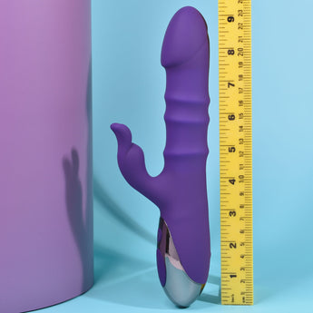 Specifications: unique 3 ring moving shaft Rabbit Vibrator. Materials: Body safe Silicone, Phthalate free, Latex free. Size height 9.25 inches, depth 3.06 inches, width 1.7 inches, diameter 1.53 inches. 3 thrusting shaft speeds. 10 vibrating shaft speeds and rhythms. 10 vibrating Clitoral speeds and rhythms. Hold power button for 2 seconds to turn on/off. Additional buttons control vibrations and speeds. Magnetic USB Rechargeable. Charging time 200 minutes. 90 minutes run time on high power. 110 minutes run time on low power. Waterproof vibrations. Submersible for easy cleaning and play outside the bedroom. 5 years manufacturer's warranty. Care: only use a water based personal lubricant. Clean with a toy cleaner, rinse with warm water, pat dry dry before storage. Categories: Vibrators, Rabbit Style Vibrators, Rechargeable Vibrators, Sex Toys for Women, G-Spot Rabbit Style Vibrator. Play with me. Playboy and Rabbit Head design are registered trademarks of Playboy International. All rights reserved. 2023.