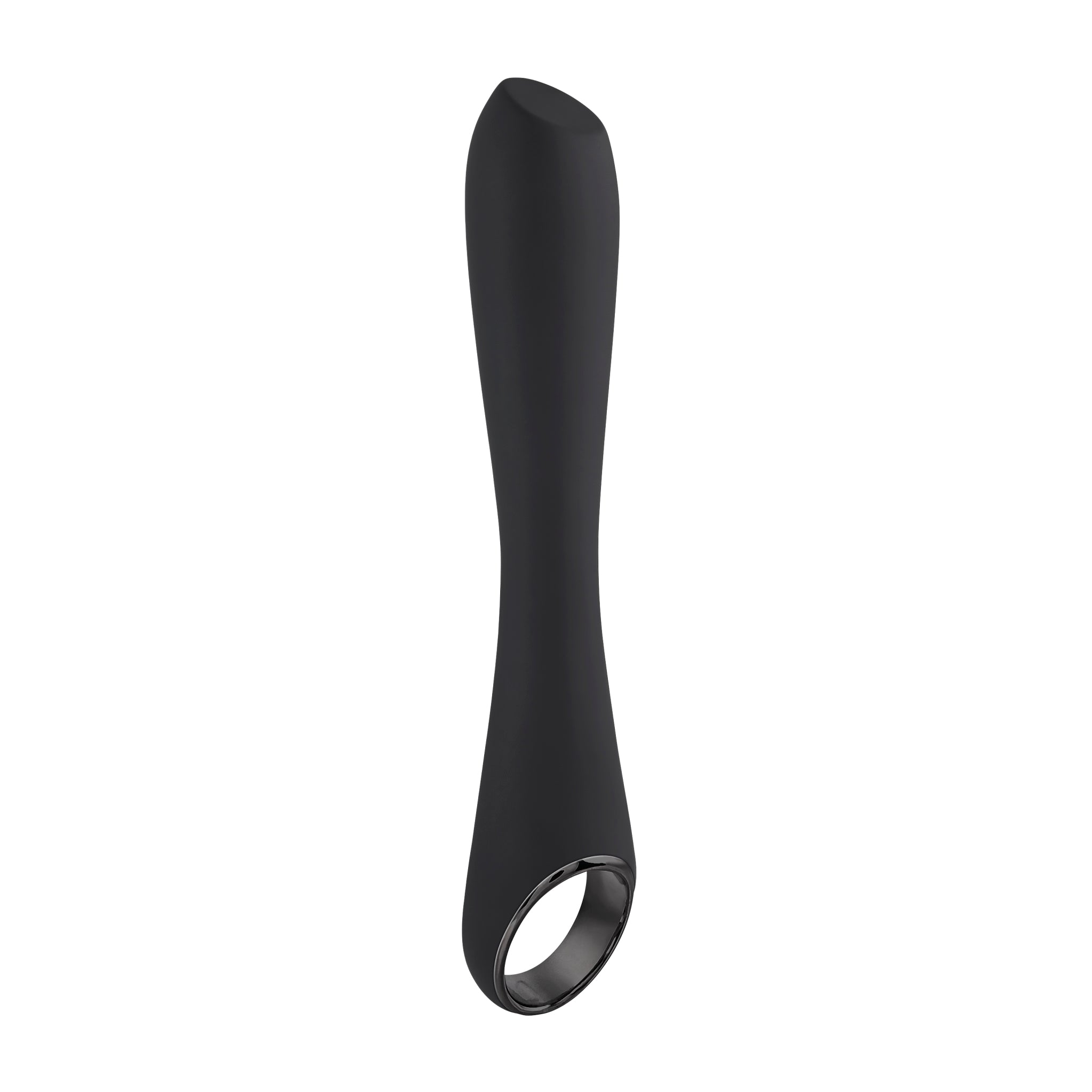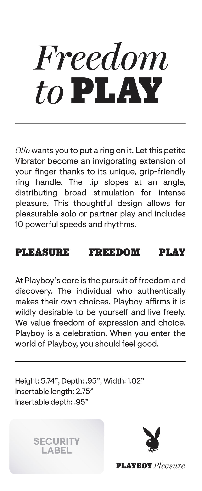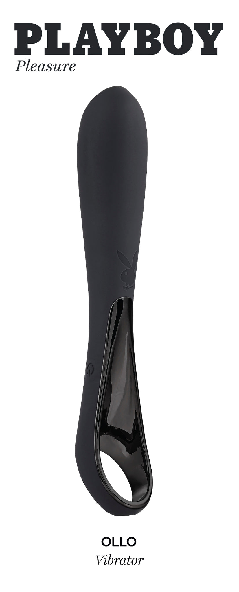 Playboy Ollo Black Vibrator from Evolved Novelties. Ollo Freedom to Play: Ollo wants you to put a ring on it. Let this petite Vibrator become an invigorating extension of your finger thanks to its unique, grip friendly ring handle. The tip slopes at an angle, distributing broad stimulation for intense pleasure. This thoughtful design allows for pleasurable solo or partner play and includes 10 powerful speeds and rhythms. Play with me key feature: targeted vibrations, flat lipstick shaped tip, ring handle. Vibration 10 speeds and rhythms. Material: made with body safe Silicone. Both Phthalate free and Latex free. Waterproof vibrations. Five years warranty. Rechargeable: USB cable included. Size specifications: height 5.74 inches, depth .95 inch, width 1.02 inches. Insertable length 2.75 inches, insertable depth .95 inch. Do not use oil base personal lubricants. These can corrode the toys materials. Care: clean product with toy cleaner or soap and water. Followed by a warm water rinse. Pat dry before storing. Categories: Vibrators, Classic Vibrators, Rechargeable Vibrators, G-Spot Stimulators, Sex Toys for Women. 2023.
