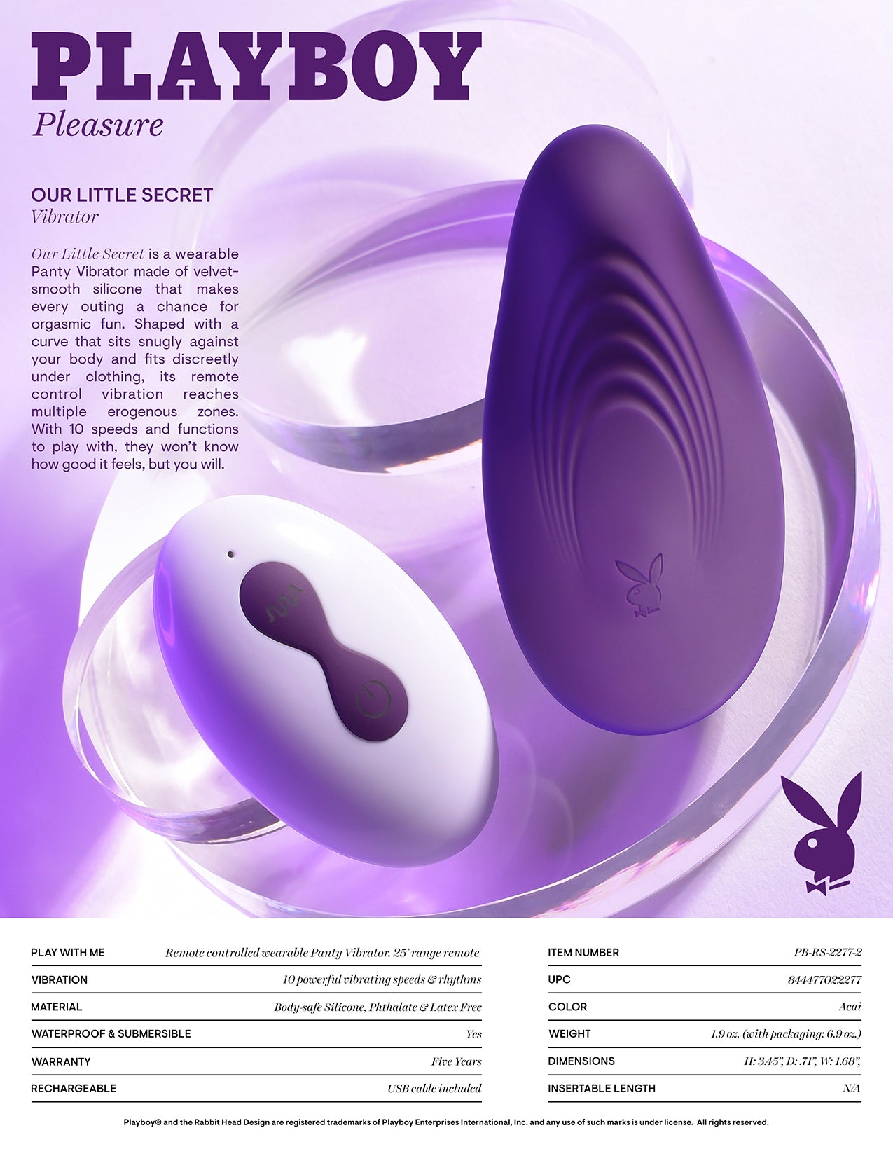 Playboy Our Little Secret Panty Vibrator from Evolved Novelties. The freedom to play is yours with Playboy Pleasure. Our Little Secret is a wearable Panty Vibrator made of velvet smooth Silicone that makes every outing a chance for orgasmic fun. Shaped with a flexible curve that sits snugly against your body and fits discreetly under clothing, its remote control vibration reaches multiple erogenous zones. With 10 low noise speeds and functions to play with, they will not know how good it feels, but you will.