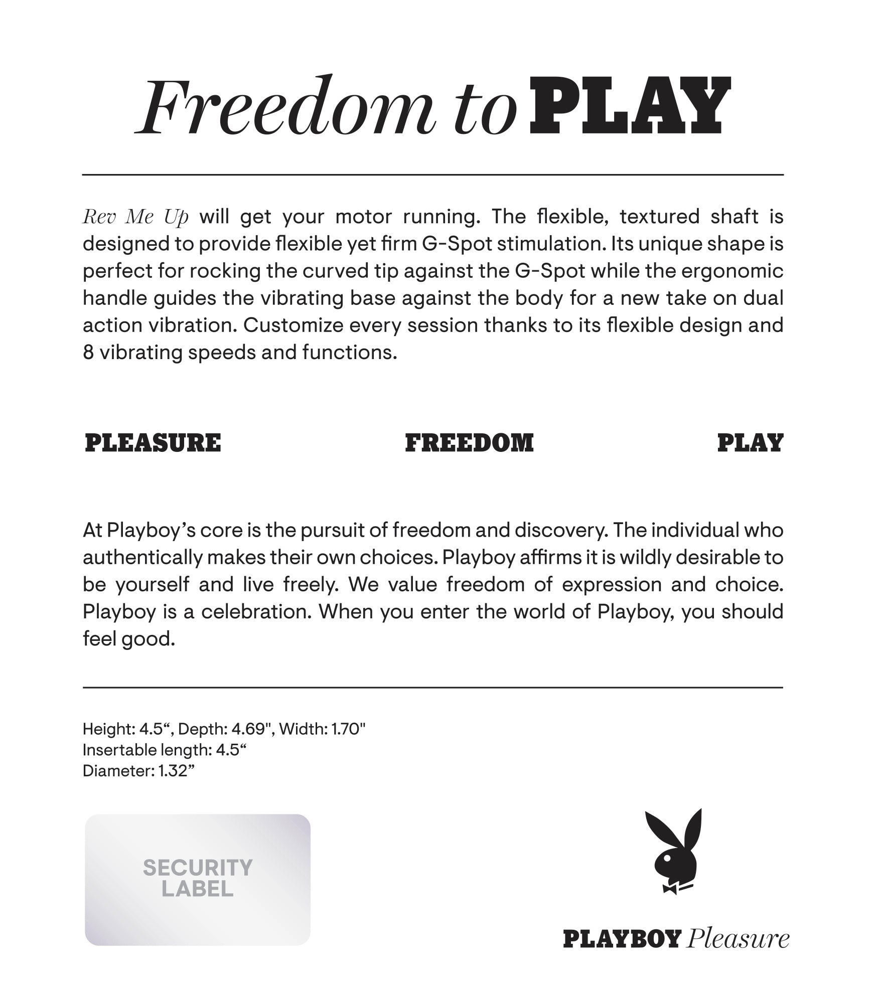 Playboy Pleasure Rev Me Up Vibrator from Evolved Novelties. Freedom to Play: Rev Me Up will get your motor running. The flexible, textured shaft is designed to provide flexible yet firm G-Spot stimulation. Its unique shape is perfect for rocking the curved tip against the G-Spot while the ergonomic handle guides the vibrating base against the body for a new take on dual action vibration. Customize every session thanks to its flexible design and 10 vibrating speeds and functions. Panel details Play with me key feature: Dual motor curved Vibrator with ergonomic handle. Vibration: 8 speeds and functions in shaft and base. Materials Body safe Silicone, Phthalate free and Latex free. Waterproof and submersible. 5 years warranty. Rechargeable: USB cable included. Size specifications: height 4.5 inches, depth 4.69 inches, width 1.70 inches. Insertable length 4.5 inches, insertable diameter 1.32 inches. Categories: Vibrators, Eco-Friendly Sex Toys, Rechargeable Vibrators, G-Spot Vibrator, Sex Toys for Women, G-Spot Flexible Vibrators. 2024.