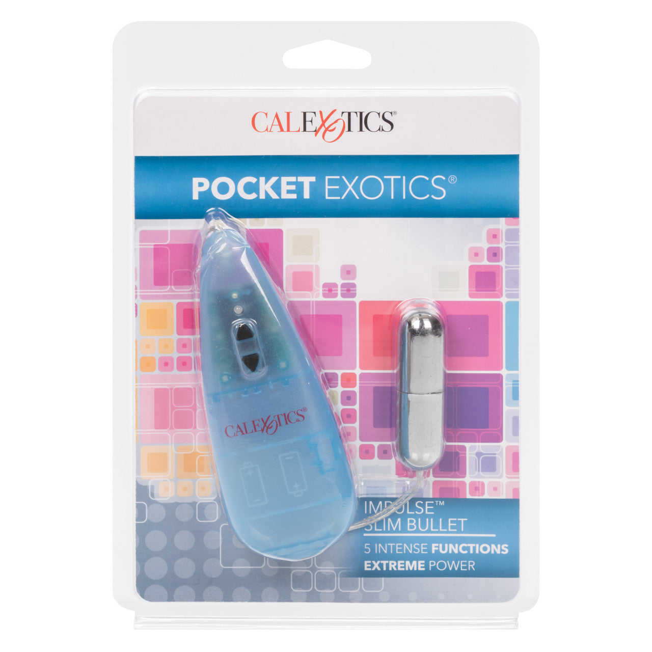 Pocket Exotic Impulse Pocket Pack Slim Silver Bullet Vibrator from California Exotic Novelties. Experience 5 levels of intensity with this Silver Bullet Vibrator. Powerful functions of vibration and pulsation. 2 vibration settings, 2 pulsation settings and one pulsate/vibrate setting. The discreetly sized Pocket Exotics Impulse Silver Slim Bullet is a compact personal massager that boasts 5 intensely powerful vibration and pulsation functions. The ultra sleek and slim bullet shaped stimulator is designed for erotic exploration and sensual satisfaction and is ideal for intimate play wherever you go. The easy to use slim bullet vibrator measures 2.25 inches by .75 inch. Bullet Vibrator is made from body safe silver plated ABS Plastic. The tantalizing power is controlled via a teardrop shaped Polypropylene PP controller that features EZ touch controls. Insert 2 AA batteries to power up the orgasmic sensations. The pocket friendly vibe offers a choice of 5 vibration and pulsation functions that can be used to massage and stimulate the erogenous zones. To maximize your sensual experience always use a quality lube. Explore your secret fantasies with the compact travel sized companion that wants you to have unlimited fun. The power packed Slim Silver Bullet stimulator is ideal for first time users, and for experienced adventurers with a wickedly wild side. Before and after every use, clean the stimulator with a toy cleaner spray. Bullet measures 2.25 inches long by .6 inch. Vibrating bullet requires requires 2 AA batteries, not included. Do not leave batteries in the vibrator between uses. A water based lubricant is recommended. Made using phthalate free, non-toxic materials: ABS Plastic with Silver Plating. Bulk weight .9 ounce. 1 year warranty. Impulse Pocket Pak Slim Silver is a registered trademark for California Exotic Novelties. Categories: Vibrators, Bullets and Eggs, Sex Toys for Women, Vibrating Bullets and Eggs. Back of package shows in 4 different languages: DE, ES, FR and RU. 2023.