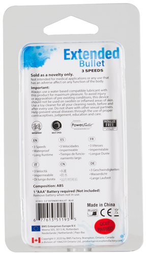Power Bullet 3.5 inches Extended Breeze 3 Speed Bullet Teal Blue from BMS Enterprises. Say hello to the Power Bullet Extended Bullet the 3 speed 3.5 inches pleasure product that allows you to put those powerful vibrations right where you want them. Whether it is for clitoral stimulation or a neck massage, Power Bullet Extended has as many uses as you need it to. Covered in a soft coat finish, with three easy presses of the button you can quickly go from mild to wild. The mild vibrations are calm, yet deep and rumbly for beginners, while the wild vibrations are fierce and powerful for more seasoned Sexperts. Power Bullet Extended is small and discreet so you can take it anywhere. It is waterproof for fun in and out of the shower and tub. Note do not remove the paper sleeve inside the battery compartment as it is needed for functionality. Key features 3.5 inches bullet vibrator. 3 speeds. Easy one press button. Soft coat finish. Waterproof vibrations. Body safe. Small and discreet. Made using body safe materials ABS Plastic. Vibrating bullet requires 1 AAA battery, not included. Categories: Vibrators, Bullets, Eggs, Sex Toys for Women, Vibrating Bullets and Eggs. Restricted, Amazon Restricted. 2024.