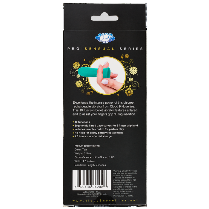 Features: 10 functions. Ergonomic flared base curves for 2 finger grip hold. Includes remote control for partner play. The whisper quiet motor is encased in body safe silicone and offers 1.5 hours of use after fully charged. As a unique added feature to differentiate this power bullet on the market today, this powerful bullet includes a wireless remote control with a range of over 75 feet, and great for couple's play. No need for costly battery replacement. 1.5 hours use after full charge. 2.5 ounces bulk weight. Circumference middle of vibrator .89 inch to top 1.03 inches. Width 4.5 inches. 4 inches insertion length. Color Teal Green. Disclaimer Notes: Warning: Cloud 9 Novelties are intended for use strictly as adult toy novelties. They are not intended for medical use and have not been clinically tested. No medical claims are warranted or implied by the use of these products. One year limited warranty. Categories: Vibrators, Bullets, Eggs, Sex Toys for Women, Vibrating Bullets and Eggs. Cloud 9 Novelties, Pennsauken NJ 08110. Manufactured for WTC MFG, LLC. Made in China. Video. MAPs price $69.00 added. 2023.