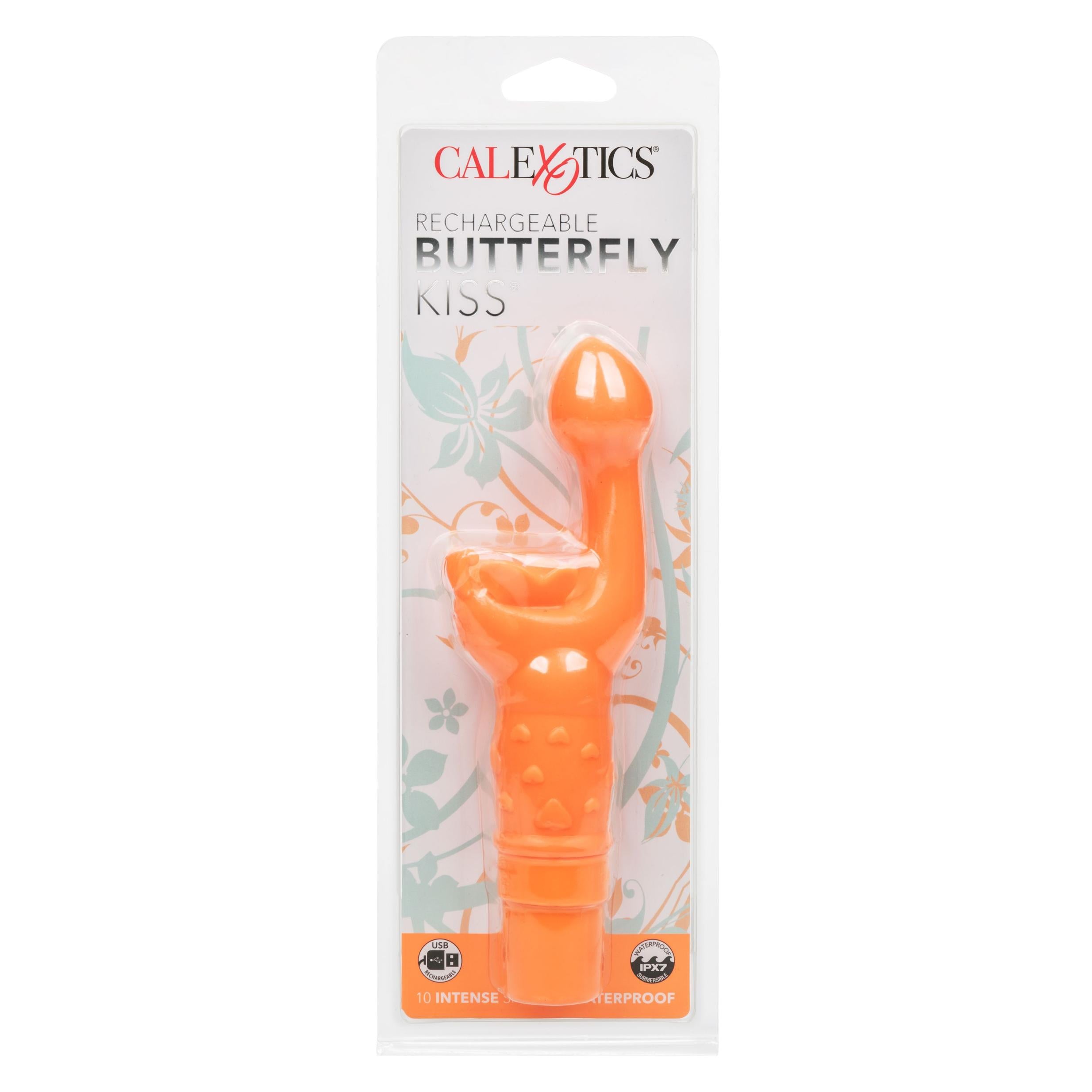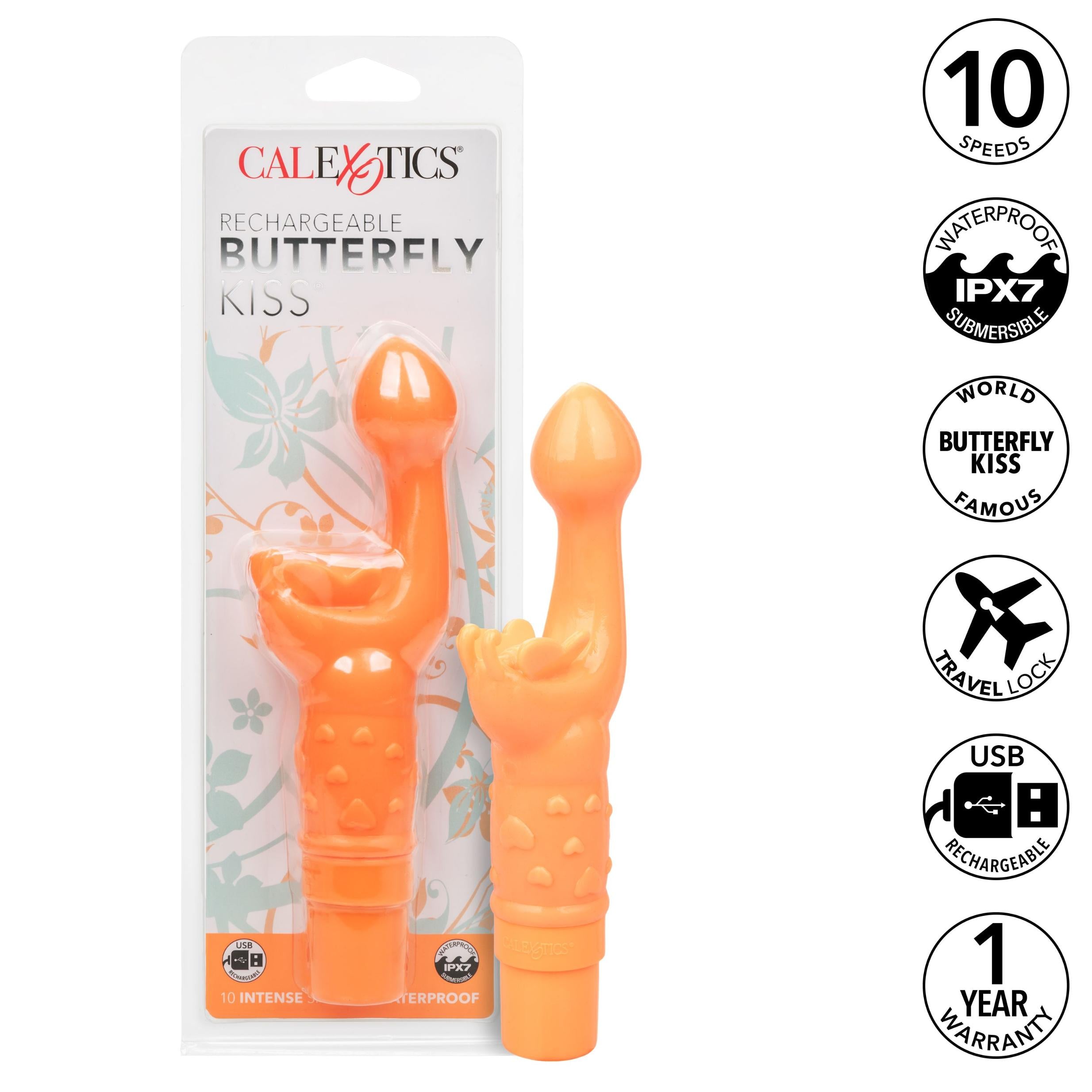 Rechargeable Butterfly Kiss Orange Vibrator from California Exotic Novelties. Indulge in the electrifying pleasure of the Rechargeable Butterfly Kiss. This sensational adult toy combines the allure of a fluttering Butterfly with a G-Spot stimulator, delivering dual stimulation that will leave you craving more. With its enticing fluttering wings and tantalizing antennae, it provides optimal arousal and titillation. With 10 incremental speeds of vibration, you have complete control over your pleasure journey, allowing you to customize the sensations to suit your desires. Crafted from body safe materials that are unscented and phthalate free, this toy prioritizes your well being while delivering intense pleasure. It is waterproof and IPX7 submersible rating adds versatility, allowing you to explore thrilling experiences in the shower or bath. Equipped with a state of the art memory chip, this sex toy remembers your last speed setting, ensuring a seamless experience every time you use it. The USB rechargeable feature provides convenience with an included charging cord. With a quick charge time of 1.5 hours, it offers up to 30 minutes of high speed stimulation and 70 minutes of blissful play on the low speed setting. Unleash your desires with the Rechargeable Butterfly Kiss, a tantalizing companion that guarantees unforgettable moments of pleasure and satisfaction.