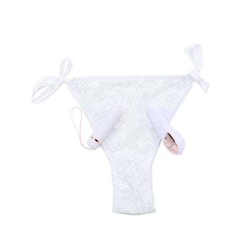 Limited Edition Bridal White with Gold Rose Inserts. Sensuelle Pleasure Panty White with Remote Control Bullet is amazingly powerful. Both the Bullet Vibrator and Remote Control are USB rechargeable. A Remote Controlled Panty Vibrator that is sure to put the party in your pants. 4 speeds + 11 pulsations. Designed for external Clitoral play. One size fits most cotton panty. Echo motor. Power level: 2. Motor sensation: fusion blend + buzzy. Rechargeable vibrations. Water submersible for play outside the bedroom. Easy to clean. Body safe. Make on the go pleasure achievable with our one size fits most panty. Made from ultra stretchy, breathable Chinlon and Spandex material with adjustable Satin ties on each hip, these panties can comfortably fit a size 55 inches waist. Our Remote Sync Technology, the remote seamlessly vibrates in tandem with the bullet vibrator allows for sensual partner play. The remote is also universally compatible with our Remote Control Bullet Plus, Petite Egg, Mini Plug, and Remote Control 15 Function Bullet USB Rechargeable Cock Ring. The Pleasure Panty is a discreet way to experience hands free pleasure at home or a night on the town. Exclusive only. 15 functions. USB Rechargeable Bullet. USB Rechargeable Remote Control. Remote vibrates in sync with Bullet Vibrator. USB charge. Charge time 2 hours. Running time 25 to 50 minutes. ABS bullet coated in Medical grade Silicone. 100% waterproof submersible. Black cotton panty with lace detail and side ties. One size fits most. Amazingly powerful, yet discreet and quiet. Wall charger not included. USB cable only. Pleasure Panty specifications: Materials: ABS Plastic + Silicone coating Bullet Vibrator, Silicone and ABS Plastic accents Remote Control, Chinlon and Spandex Panty. Size: .73 inch by 2.83 inches. Bulk weight .056 of a pound. Speeds and Pulsations: 4 speeds + 11 pulsations. Charge type: Magnetic USB charging port for the Bullet Vibrator. Pinpoint USB charging port for the Remote Control. Charging time: fully charged within approximately 3 hours to 4 hours. User time: 2 hours. Interface: 1 button Bullet Vibrator. 3 buttons Remote Control. 2 years warranty. Categories: Lingerie, Clothing, Women's Underwear, Rechargeable Vibrators, Sex Toys for Women, Hands Free Strap On Vibes, Vibrating Underwear. Please note the package is changing from white to black. Restricted, Amazon Restricted. 2023.