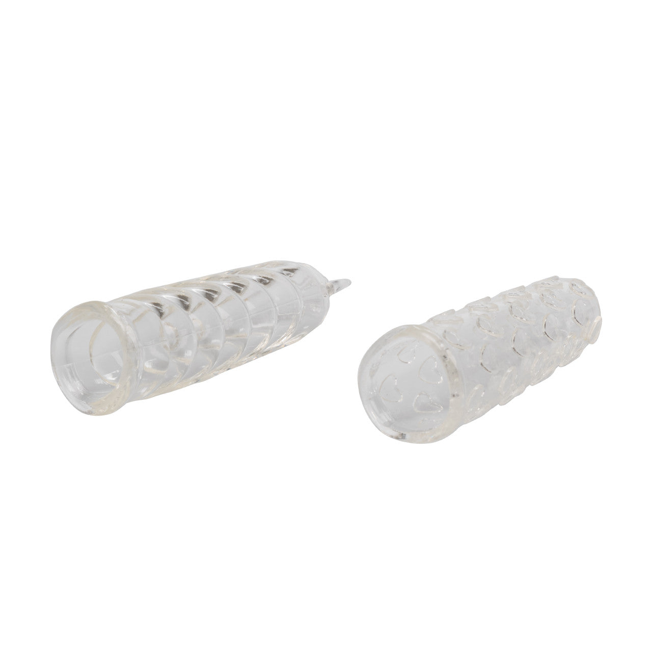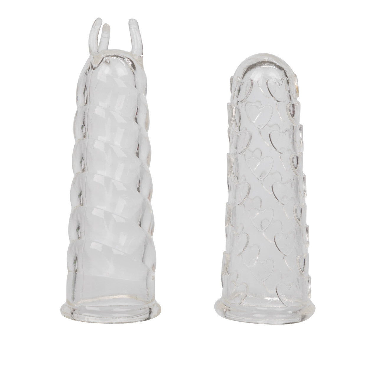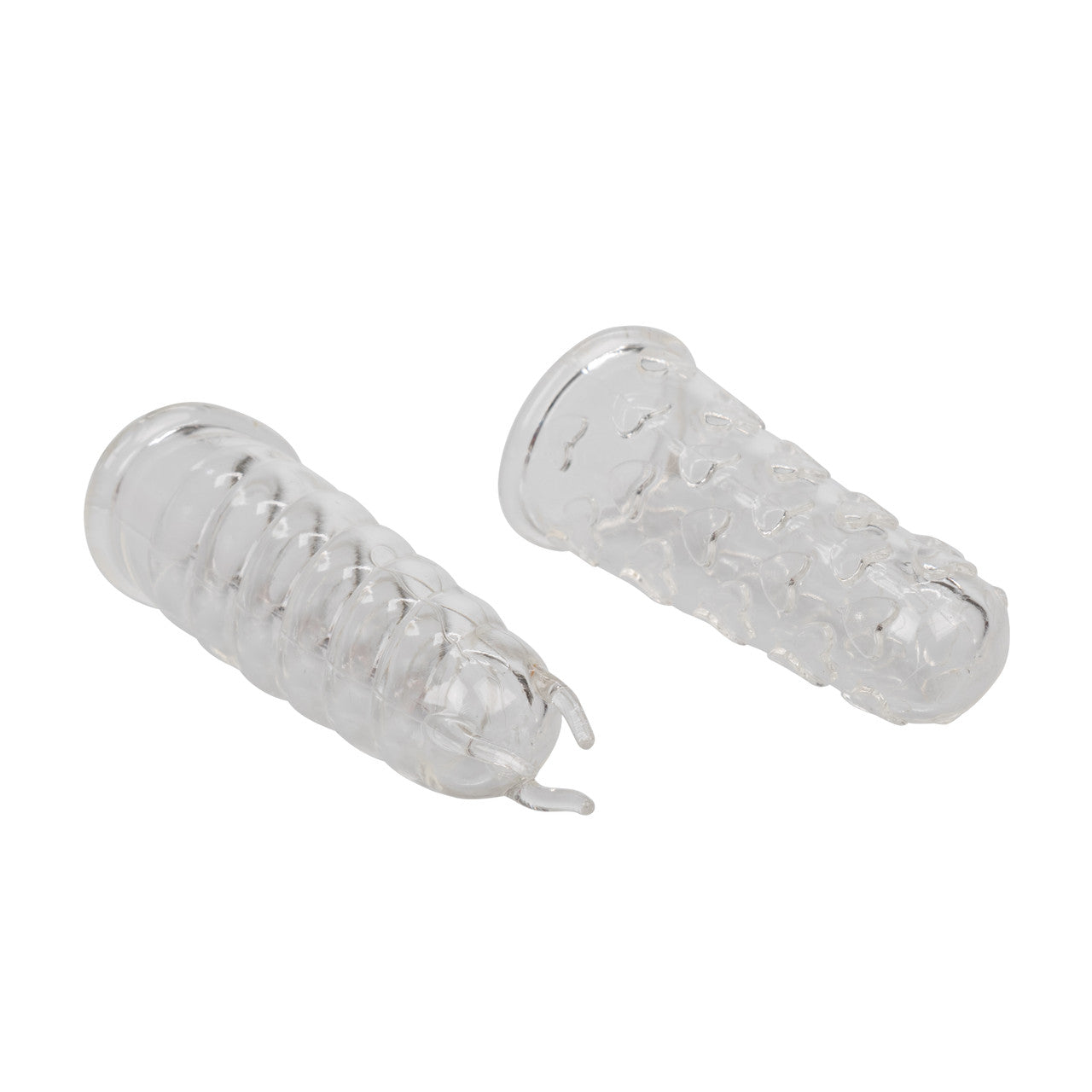 Intimate Play Silicone Finger Teasers from California Exotic Novelties. Enjoy new feelings of self gratification with the versatile Finger Teasers. The easy to use Finger Stimulation Sleeves are supplied in a pair for tantalizing erotic exploration that is limited only by your imagination. The contoured, stretch to fit Finger Teasers are textured and sensually swirled for maximized stroking, rubbing and stimulation ecstasy. The Finger Teasers are made from soft and supple, unscented phthalate free Thermoplastic Elastomers TPE. The exotic Fingertip arousers are sensually swirled and textured with love heart shaped pleasure nubs, for intensely satisfying sensuous tingles and sensations. Use with a water based personal lubricant for maximum enjoyment. Use with a water based personal lubricant for maximum enjoyment. Before and after every use, clean the finger arouser sleeves with mild soapy water or a toy cleaner spray. Finger Teasers are soft, stretch to fit, unscented, textured Finger Teasers. These Teasers are small super stretchy Finger extension or small vibrator Sleeve with external nubs. Teaser can be used on any finger on right or left hand. Small sleeve for bullet vibrator. Safe and pure for body and pleasure. Made using phthalate free, non-toxic materials unscented Thermoplastic Elastomers TPE. Tickler sleeve measures 3 inches long by 1 inch wide. Bumps sleeve measures 2.75 inches long by 1 inch wide. Always clean before and after use plus between partners. Finger Teasers is a registered trademark for California Exotic Novelties. Sex toys and sexual wellness. Categories: Sex Toys for Couples, Sensual Kits, Vibrator Sleeves, Batteries, Storage, Odds, Ends. 2023.