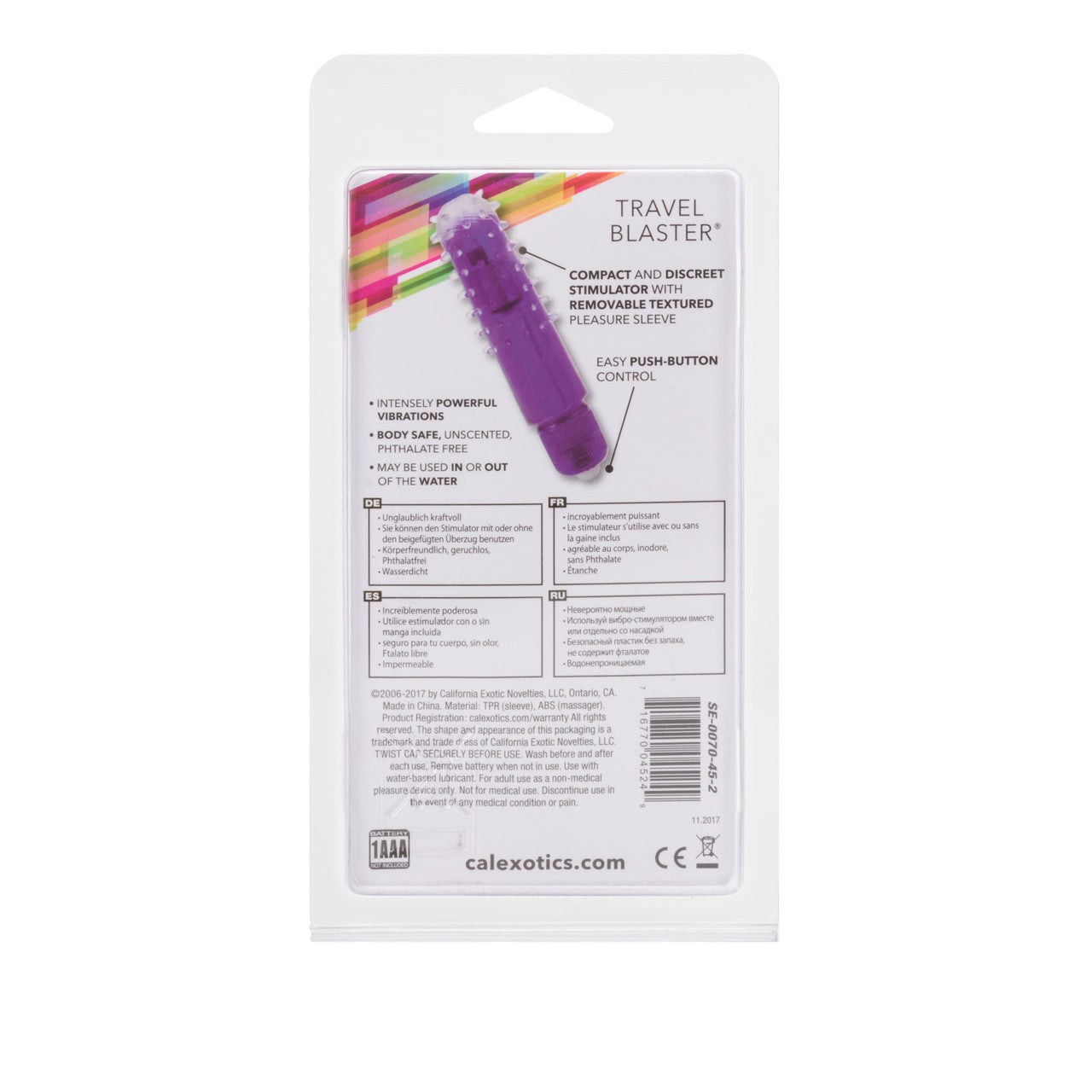 Waterproof Travel Blaster Purple Vibrator from California Exotic Novelties. The Waterproof Travel Blaster massager comes complete with a removable nubby sleeve for independent use, plus 30% more power than before! Feel the intense power of this small yet mighty adult toy and let the massager take you into life’s wet and wild moments with the most satisfying and tantalizing pleasure. Take into the bath tub for some alone time, take it into the shower for some steaming hot intimacy, or take it with you anywhere you want to get wet. It is 100% waterproof! Measuring a modest 3 inches long by 0.75 inch wide, this stylish and ergonomically designed massager makes the ideal travel product for those on the go. It is totally discreet so you can put it in any handbag or luggage bag for those naughty nights way or romantic weekend getaways with a loved one. The compact makes it a great starter product for first time users who want something that is both waterproof and packed with intense power, and the removable textured sleeve gives you so much versatility. With a simple push button control, this waterproof toy is so easy to handle, making it a simple go to product during foreplay. The massager is compatible with high quality lubricants such as our Universal Lube and it can be cleaned easily after each use. Waterproof Travel Blaster with pleasure carrying this small massager. Comes with a removable spiky sleeve is hygienically superior. The sleeve is has raised nubs to tickle and tease you. Easy to use push button control. Waterproof for fun in or out of the water. Requires 1 AAA battery, not included. Made using phthalate free, non-toxic materials: ABS Plastic Bullet Vibrator, Thermoplastic Rubber TPR sleeve. Vibrator measures 3 inches long by .75 inch wide. 1 year warranty. Waterproof Travel Blaster is a registered trademark for California Exotic Novelties. Sex toys and sexual wellness. Categories: Vibrators, Bullets, Eggs, Sex Toys for Women, Vibrating Bullets and Eggs. 2023.