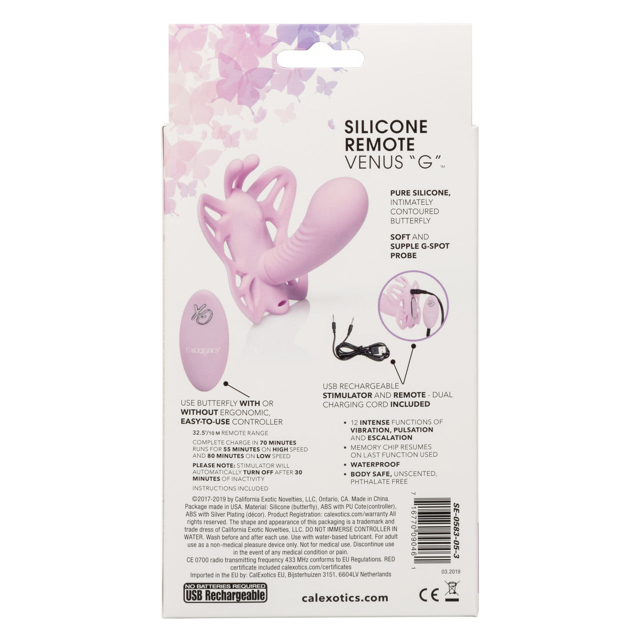 Venus Butterfly Silicone Remote Venus G G-Spot Vibrator with Clitoral Stimulator Pink from California Exotic Novelties. Prepare to be thrusted into a world of full contact stimulation with the Venus Butterfly Silicone Remote Venus G. The now world famous Venus Butterfly collection has done it again with an intimately contoured shape, pliable G-Spot Massager and 12 intense functions of vibration. Spread your wings and tease on the go with the ravishing remote control range of up to 32.5 feet away! While the sensually curved vibrator deliver knee shaking G-Spot stimulation, the contoured butterfly hugs close to your body for external teasing. To use with the remote: hold the push button control for 3 seconds to turn on/off and use the XO button to cycle through 12 vibration, pulsation and escalation functions. While the easy to use vibe can be used with or without the remote to control the intensity, the integrated state of the art memory chip remembers just how you like it by starting on the last function used. Recharge the premium Silicone Massager in 70 minutes with the provided dual charging USB cable to enjoy 55 minutes of high speed stimulation or 80 minutes of low speed vibrations. Massager will automatically turn over after 30 minutes of continuous use. The hypoallergenic premium Silicone is body safe, unscented and phthalate free to keep you most sensitive spots, happy and healthy. This item features a state of the art memory chip that will resume on the last function used. Reignite the pleasure, right where you left off. Designed for easy use, you will find operation a snap even on the darkest night. Frustration free and perfect for pleasure, just one push brings intense stimulation your way. This long range remote works for a substantial distance, try it across the room, then close in on pleasure. Maximize your pleasure with full coverage that brings ecstasy with ease. You will get everything you need to find exactly what you desire. Bulk weight 4.2 ounces. Materials Silicone, ABS Plastic with Polyurethane PU Cote, ABS Plastic with Metallic Plating. Functions a variable speed control takes you to the height of gratifying pleasure. You will find sensual stimulation that throbs with excitement. 12 functions bring you thrilling elements of vibration, pulsation, and escalation. Experience the ultimate bedroom adventure! 1 year warranty. Battery information this product includes USB charging capabilities. Measurements 3.5 inches by 3 inches Butterfly. 3 inches by 1 inch Shaft. Categories: Vibrators, Eco-Friendly Sex Toys, Rechargeable Vibrators, G-Spot Vibrators, Sex Toys for Women, G-Spot Clit Stimulators. 2023.