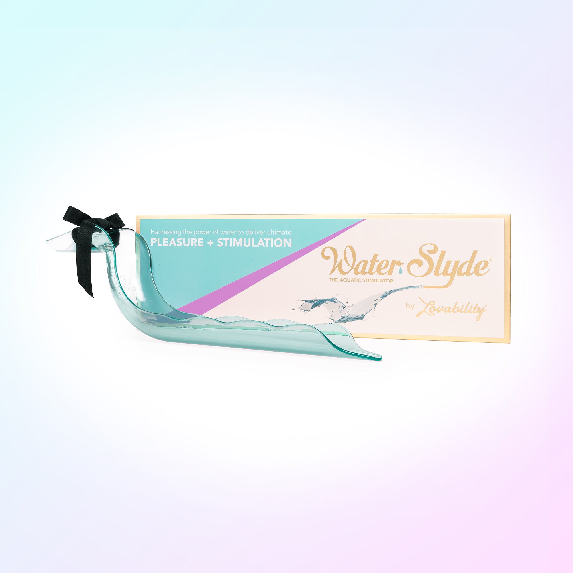 Waterslyde Aqua Maureen Aquatic Stimulator from Lovabilty. The patented Waterslyde, is a sleek plastic water diverter that simply attaches to most forward facing bathtub spouts. The water flow is easily directed to the midline of the bathtub, allowing a woman to comfortably position herself in the tub such that the water falls directly to where it counts. The bathtub technique, can be great fun but not always easy to achieve. Until now! Dimensions 16 inches by 3.5 inches by 2 inches. Creator Maureen Poliack. For external use only. Use the suede like ribbon to tie to bath tub faucet. Caution of hot water. Body safe. Hands free. Disability friendly. Recyclable. Satisfaction guaranteed. XBIZ Award Nominee. "After owning it for a few weeks...I can not stop using this thing!" Ducky Doolittle. Categories: Health and Beauty Aids, Bath Time. Sex Toys for Women, Unnatural Dildos and Dong. Made in the USA. New Video. Amazon Restricted. 2022.