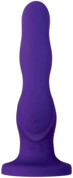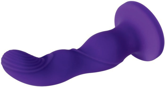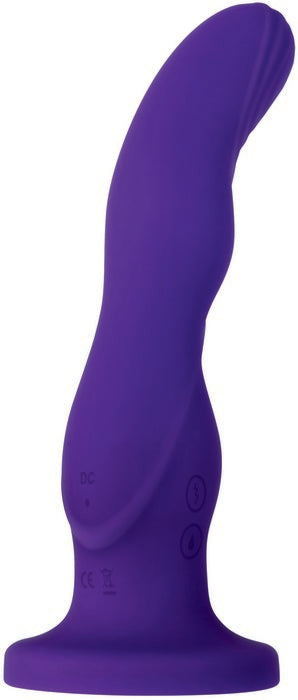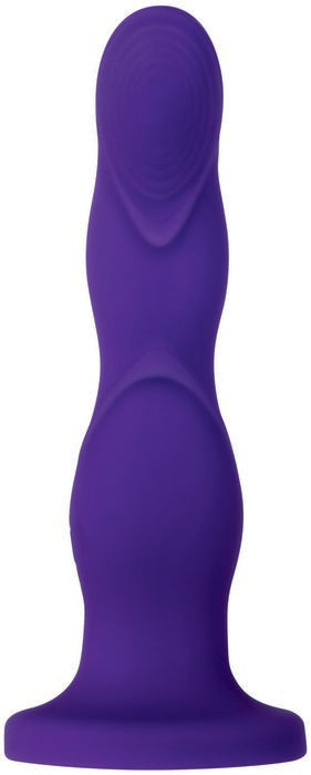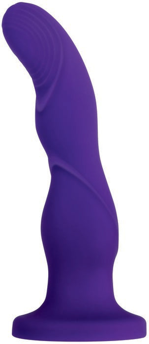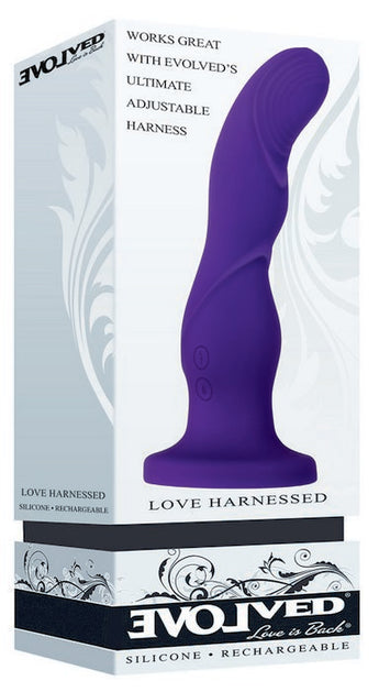 (WD) Love Harnessed Purple Rechargeable Vibrating Dildo from Evolved Novelties. Love is back. 5 year warranty. Body safe. Waterproof. Strap on rechargeable vibrator. Great for couples play, role reversible, women only and more. Curved tip reaches her g-spot or his p-spot. Fits Evolved Novelties harness or other harnesses. Not included, sold separately. Includes 1.75 inches silicone O-ring. Powerful motor with 7 different functions. Made from luxurious silicone. Erotic detailed vein texture. Height 6.25 inches, depth 3 inches, width 1.5 inches. Weight 4.9 ounces. Color Purple. No longer available. 2023.