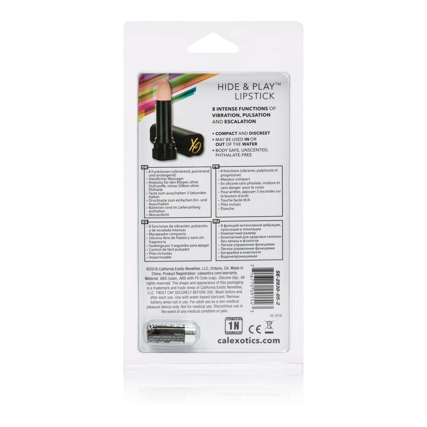 (WD) Hide and Play Lipstick Vibrator Nude from Cal Exotics. Slim, stylish and ready for your next adventure, the discreet Hide & Play Lipstick is the playful travel-loving vibe bullet that you have been dreaming of. Enjoy total pleasure to go by slipping the mini masssager into your purse and spice up the night whenver the urge takes you. This bold lipstick vibe has 8 powerful vibration functions controlled with a single frustration free button. The intense vibrations are sent throughout the compact bullet for mind-blowing external stimulation. This versatile bullet is an discreet, travel size option for bashful beginners or the erotic experts. Whether you are looking to spice things up in the bedroom or sneak in sensual solo time, this mini vibe is ready to go. The unique lipstick shaped tip is designed to deliver powerful pinpoint stimulation or a full contact teasing action. Power up your pleasure with a single N battery. The discreet lipstick disguise makes it the mini massager the ideal travel companion, letting you enjoy radiating pleasure wherever your fantasies take you. Color Nude. Materials Silicone, ABS Plastic with Polyurethane PU Cote.