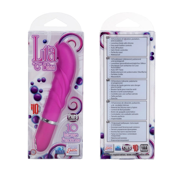 (WD) Lia G Bliss Vibrator is available in two colors: Blue and Pink. Each sold separately. Lia is for Lovers. Pure premium Silicone massagers, stimulators, and probes designed for today's discerning shopper. Only the finest of materials and components are used create this outstanding collection! New designs, new motors! Premium quality Silicone massagers with 6 styles to choose from 10 incredible functions of vibration, pulsation, and escalation. Satin Finish controller with easy push buttons. Easy to operate. Auto on/off. Safe and pure for body and pleasure. Made using phthalate free, non-toxic materials Silicone massager, buttons, ABS Plastic with Polyurethane PU Cote cap, ABS Plastic with silver plating decorative ring. Vibrator measures 4.25 inches long by 1 inch wide. Bulk weight 2.3 ounces. Vibrating sex toy requires 1 AA battery, not included. Do not leave battery in the vibrator between uses. A water based lubricant is recommended. Category: New Items, For Women, Vibrator, Vibrators. Featured in the July 2012 Supplement page 37. Lia G Bliss Pink Vibrator is a registered trademark for California Exotic Novelties. No longer available. 2023.