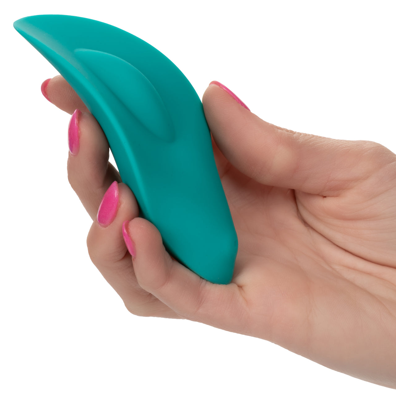 (WD) Pixies Hummer Vibrator from California Exotic Novelties. Slip the Pixies Hummer in between your fingers to deliver knee shaking sensation to your favorite pleasure points. The sensually contoured shape, dual sided design and 10 thrilling functions of vibration make this the perfect teasing travel companion. The curved massager fits in the hand to let you deliver pinpoint tantalization and thrill with contoured vibrations. Get playful with each increase of the 10 incremental speeds of vibration with the easy touch control button. Effortlessly control pure pleasure with an easy touch silicone button and hold for 3 seconds to turn on or off. The ultra plush Liquid Silicone and uniquely flexible body are great for exploring sensual sweet spots and full body exploration. With a smooth shape and supple surface, you will be able to indulge in thrilling vibrations from any angle your desire. Use the smooth single button control to enjoy up to 1.5 hours of vibrating pleasure. Charge up your passion in only 2.5 hours by plugging the provided USB cable into the self sealing charging port on the back of the massager. The slim massager discreet 4 inches size makes it the perfect travel companion, letting you embrace radiating pleasure wherever your fantasies take you. SKU SE-4375-15-3. Color Blue. Power source USB Rechargeable included. 1 year warranty. Material type Silicone, ABS Plastic with Metallic Plating.