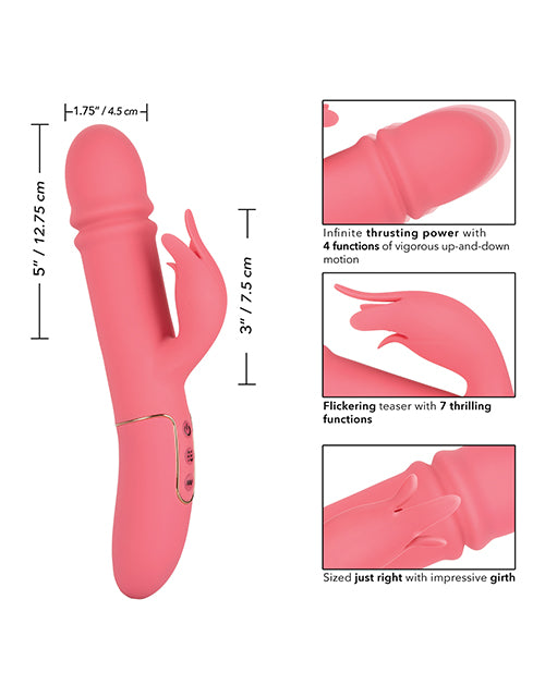 (WD) Shameless Tease Rabbit Style Vibrator from Cal Exotics. The power-packed Shameless Tease delivers earth-shaking pleasure with 7 functions of vibration, 4 functions of thrusting and a flickering teaser. This insanely powerful massager will send you speeding towards ecstasy with up to 850 thrusts per minute. Dial in to exactly what you desire with the power 7 pulsation, vibration and escalation functions and 4 independently controlled thrusting functions. Flicker to your favorite setting with the easy touch control buttons for frustration free control. The silky smooth silicone and gold plated decor base make this vibrator a stylish addition to any pleasure toy box. Get playful with up to 70 minutes of passionate pulsations with the sleek 3 button controls. Use the provided USB charger to recharge your passion in only 2 hours. The compact size and travel lock button feature make this game changing massager the perfect travel companion and let you embrace knee shaking pleasure wherever your fantasies take you.