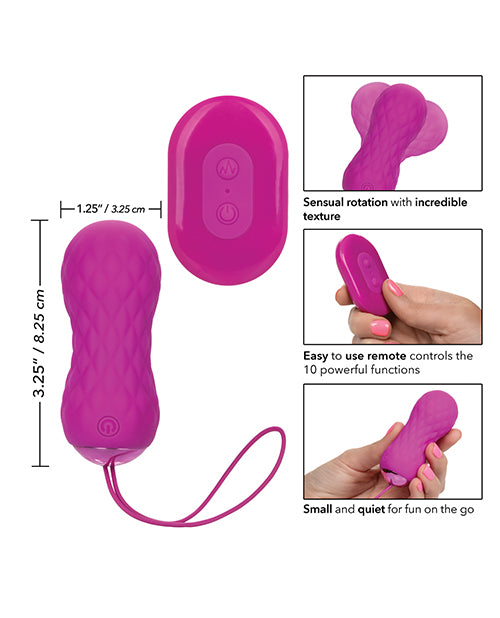 (WD) Slay Spin Me Vibrator from California Exotic Novelties. Losing your toys when you are losing your mind? The Slay Spin Me comes with an advanced retrieval cord, ensuring that your device is always close by your side. The truly unique design allows for a spinning motion, and this incredibly textured adult toy can be controlled with or without a remote control, so you can give your partner the power to control your pleasure from up to 30 feet away! The silicone design ensures body safe materials, and the 10 powerful functions of synchronous vibration. Plus rotating action ensures that your every need is met. Sound confusing? Fret not my stimulated friend: The advanced, state of the art memory chip will save your last used setting and resume up when you start again, eliminating any confusion. Simply find the setting you like most, and stick with it or be a little bit more adventurous and do not! Both the stimulator and remote are USB rechargeable with dual charging cable included and reach a charging completion in just 90 minutes. All that power from the wall can be depleted in 80 minutes on low speed, which should tell you exactly how powerful the motors are. Want even more? Suck that juice down in 50 minutes on the highest possible setting if you dare!
