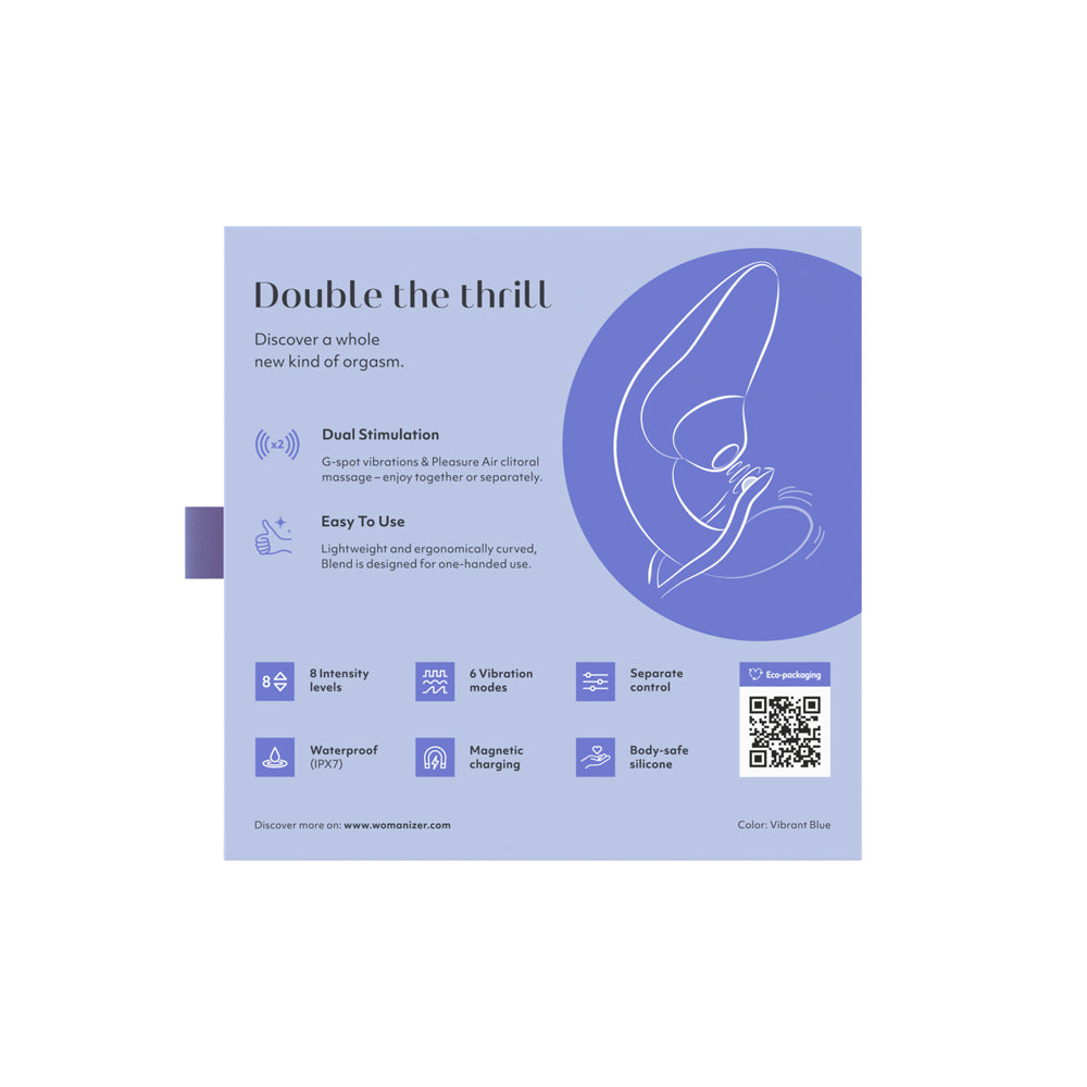 - Packaging contains: Womanizer Blend, Quick Start guide, Compliance & Safety Information, #Imasturbate sticker