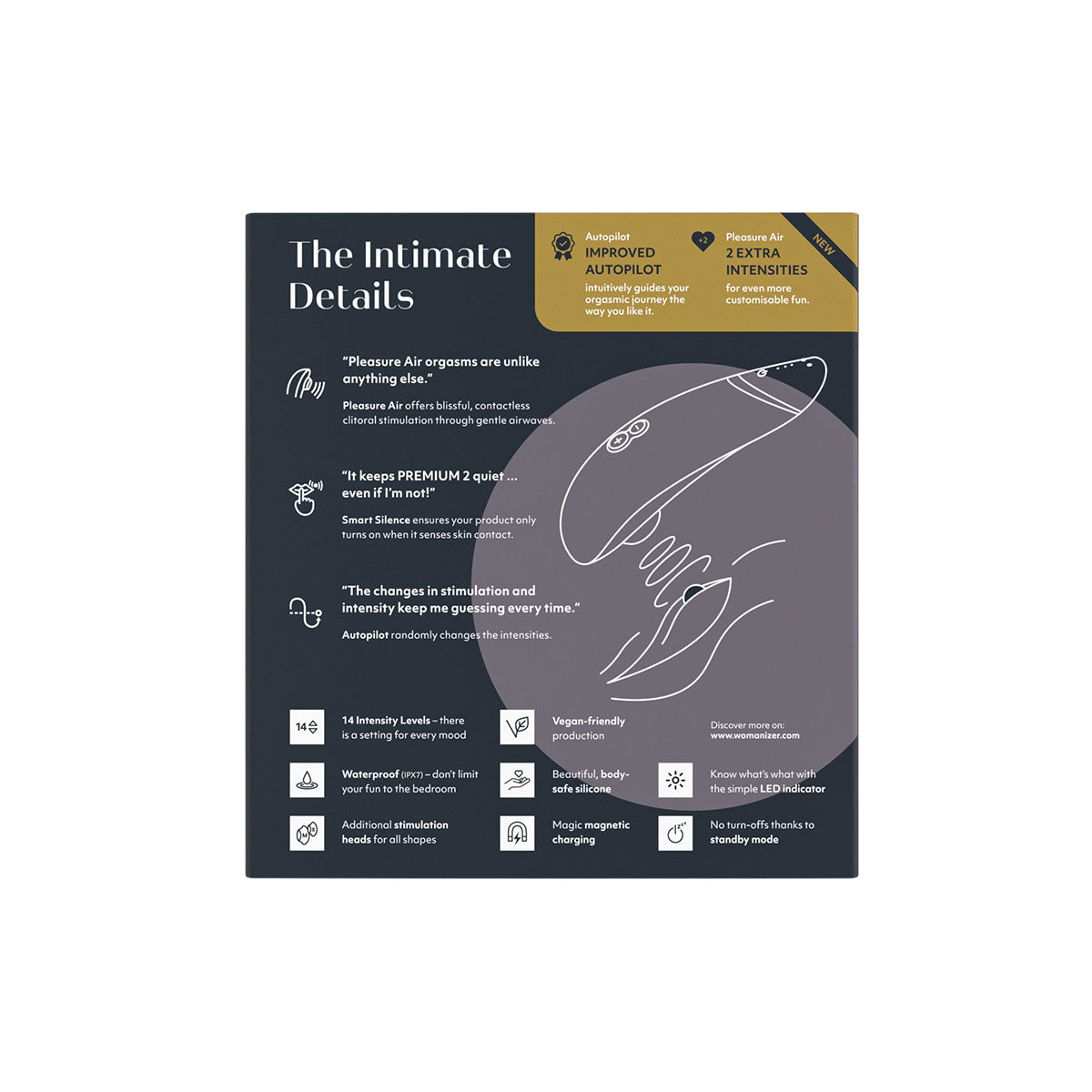Luxurious and efficient, Womanizer Premium 2 uses Womanizer's ground-breaking, original Pleasure Air Technology to offer mind-blowing orgasms in record time.