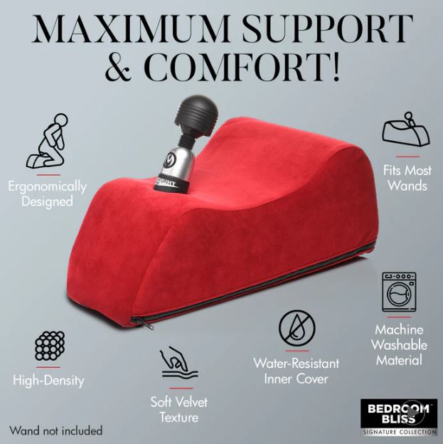 With this high-density foam pillow, you get all the support you need while riding the edge of pleasure! This pillow is ergonomically designed to fully support your weight. The 7 inch deep, open-ended pocket fits nearly any wand vibrator so it stays in place as you enjoy hands-free stimulation! As a bonus, the soft outer cover and the water-resistant inner cover are both machine washable! Enjoy hands-free stimulation as you straddle the ultra soft pillow, effortlessly lifted up so you can enjoy your partner's passionate affections or angle yourself to ride the toy of your choosing as you indulge in solo-play! The toy pocket at the top fits most toys but is especially designed for wands, vibrators and dildos. Spice up your sex life and use a vibrator while getting penetrated by your partner!