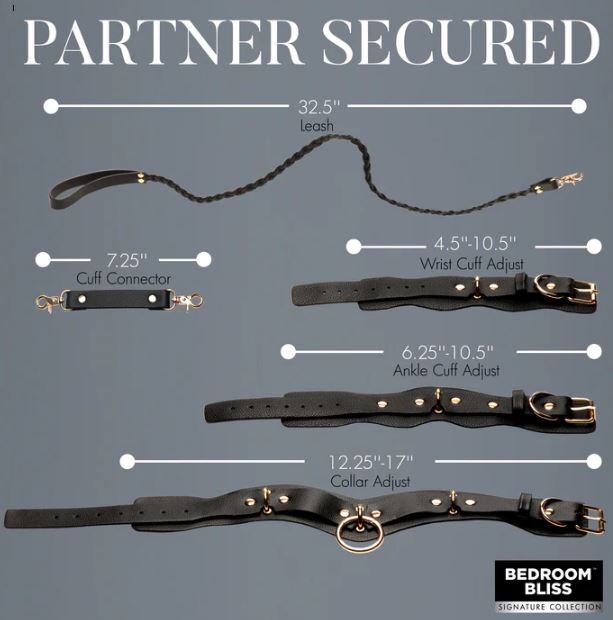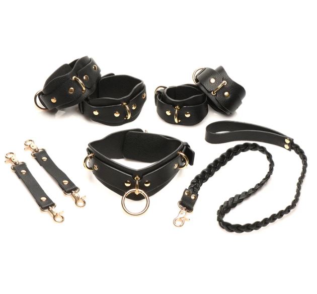 Features: Full, Kinky Set: Includes wrist cuffs, ankle cuffs, a collar with braided leash, and 2 cuff connectors. Adjustable Straps: All cuffs and the collar adjust for a comfortable fit. Vegan Leather: This vegan leather set has a realistic texture and design that makes it look like classic, leather bondage. Nickel-Free Metal: All the metal including the O-ring, D-rings, buckles and clips are gold colored and nickel-free.