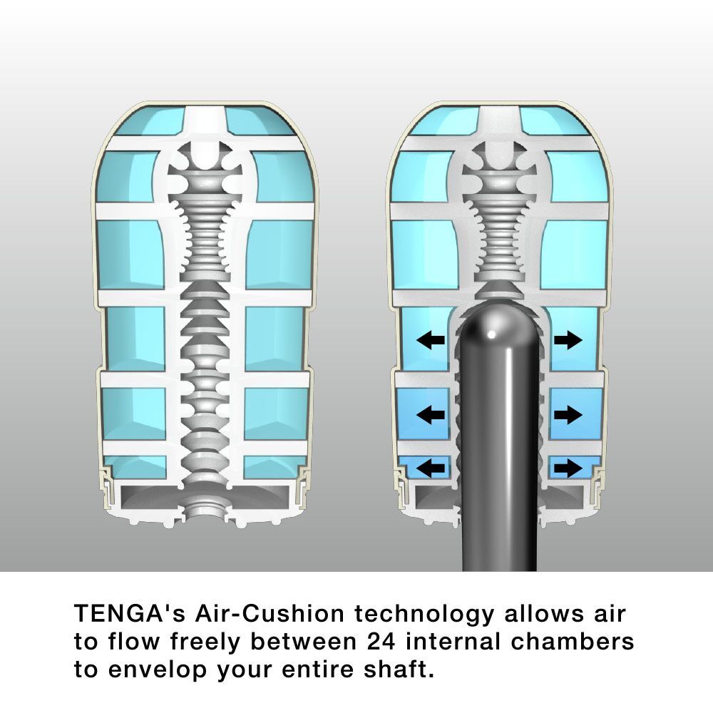Tenga new adult concept Air Cushion Cup male masturbation device. Size 2.56 inches in depth by 2.56 inches in width by 6.10 inches in height. Insertion length 5.80 inches, insertion width 2.43 inches. Bulk weight 0.38 pound. Other specifications: disposable, prelubricated. Materials: insert sleeve Thermoplastic Elastomer TPE, casing polyethylene PE. Lubricant ring polyurethane PU. Lubricant: Water, Glycerin, Propylene Glycol, Hydroxyethylcellulose, Sodium Polyacrylate, Phenoxyethanol, Methylparaben, Hydroxypropyl Beta Cyclodextrin, IPBC. Internal lubricant: Water, Glycerin, Sodium Polyacrylate, Phenoxyethanol, Methylparaben, Hydroxypropyl Beta Cyclodextrin, IPBC. Lubricants certified by EU Directive 76/768/EEC toxicological assessment. Categories: Male Masturbators, Sleeves and Rings, Masturbators, Masturbation Sleeves. Restricted, Amazon Restricted. Video. 2022.